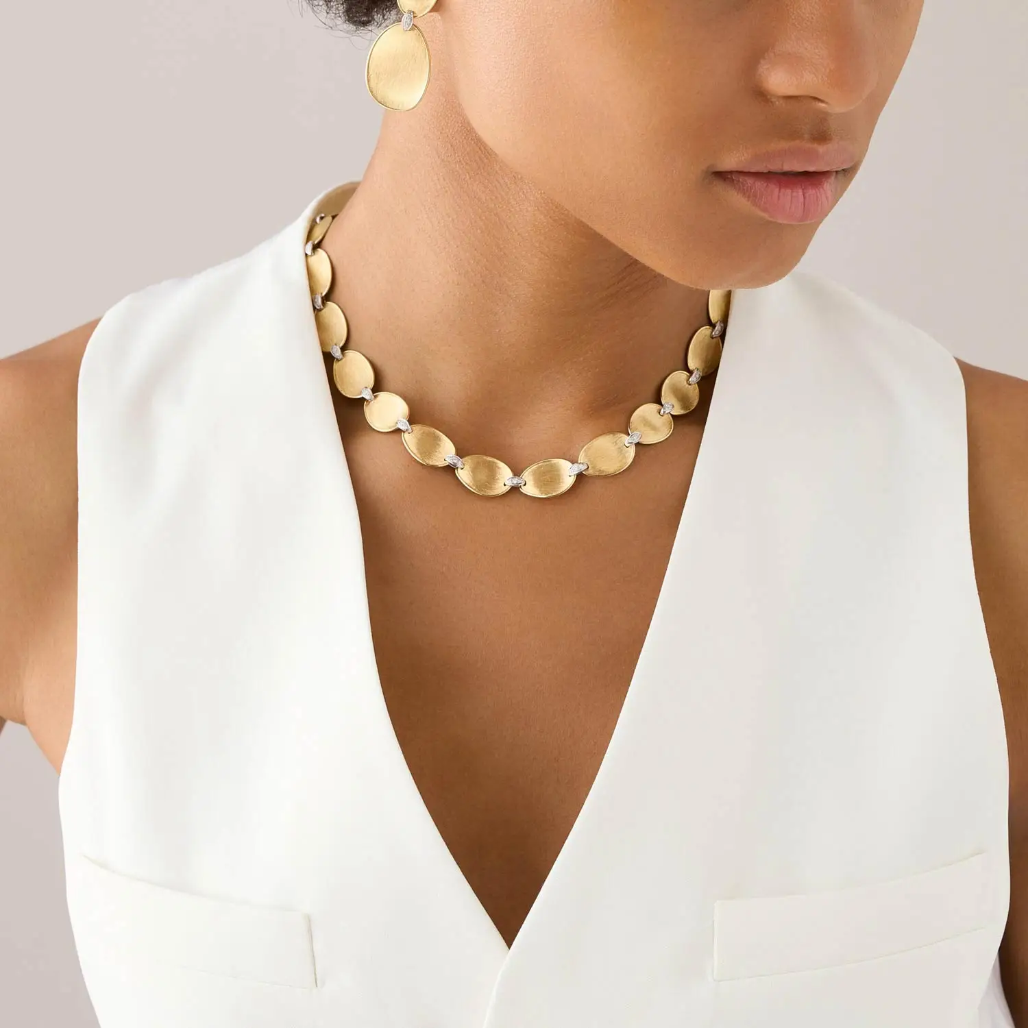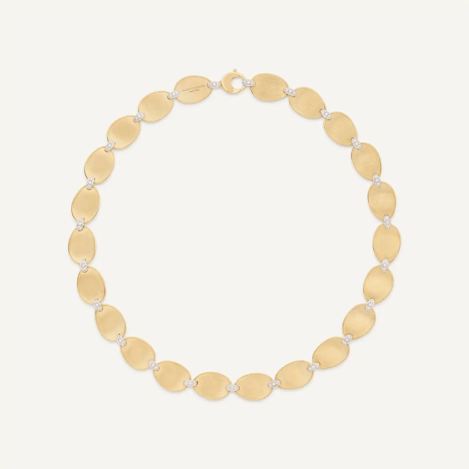 Mỗi tác phẩm được chế tác thủ công theo kỹ thuật truyền thống trong xưởng Marco Bicego. Bề mặt vàng được khắc bulino thủ công, tạo hiệu ứng mờ mịn như nhung. Chi tiết này mang lại sự tương phản độc đáo giữa nét mềm mại của hình khối và chiều sâu của cấu trúc kim loại.