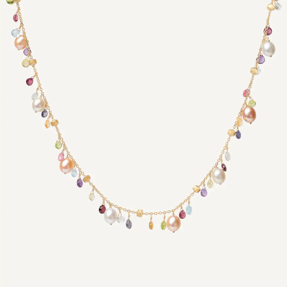 Chiếc dây chuyền vàng Marco Bicego Paradise CB2584-E MIX114 Y 02 được chế tác từ vàng vàng 18K (750/1000) và thuộc bộ sưu tập Paradise, tôn vinh vẻ đẹp của các loại đá quý tự nhiên nhiều màu sắc. Thiết kế kết hợp dây chuyền vàng mảnh với đá quý nhiều màu và ngọc trai nước ngọt, tạo nên vẻ đẹp hài hòa và nổi bật.