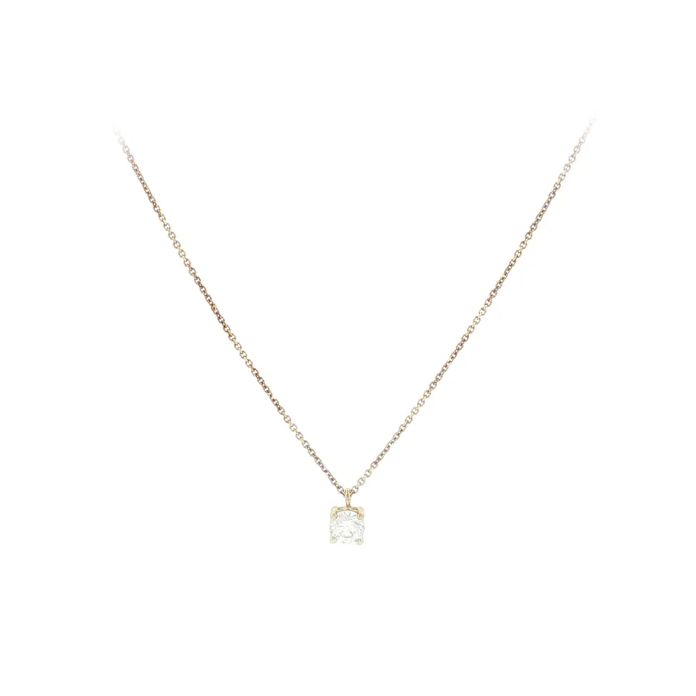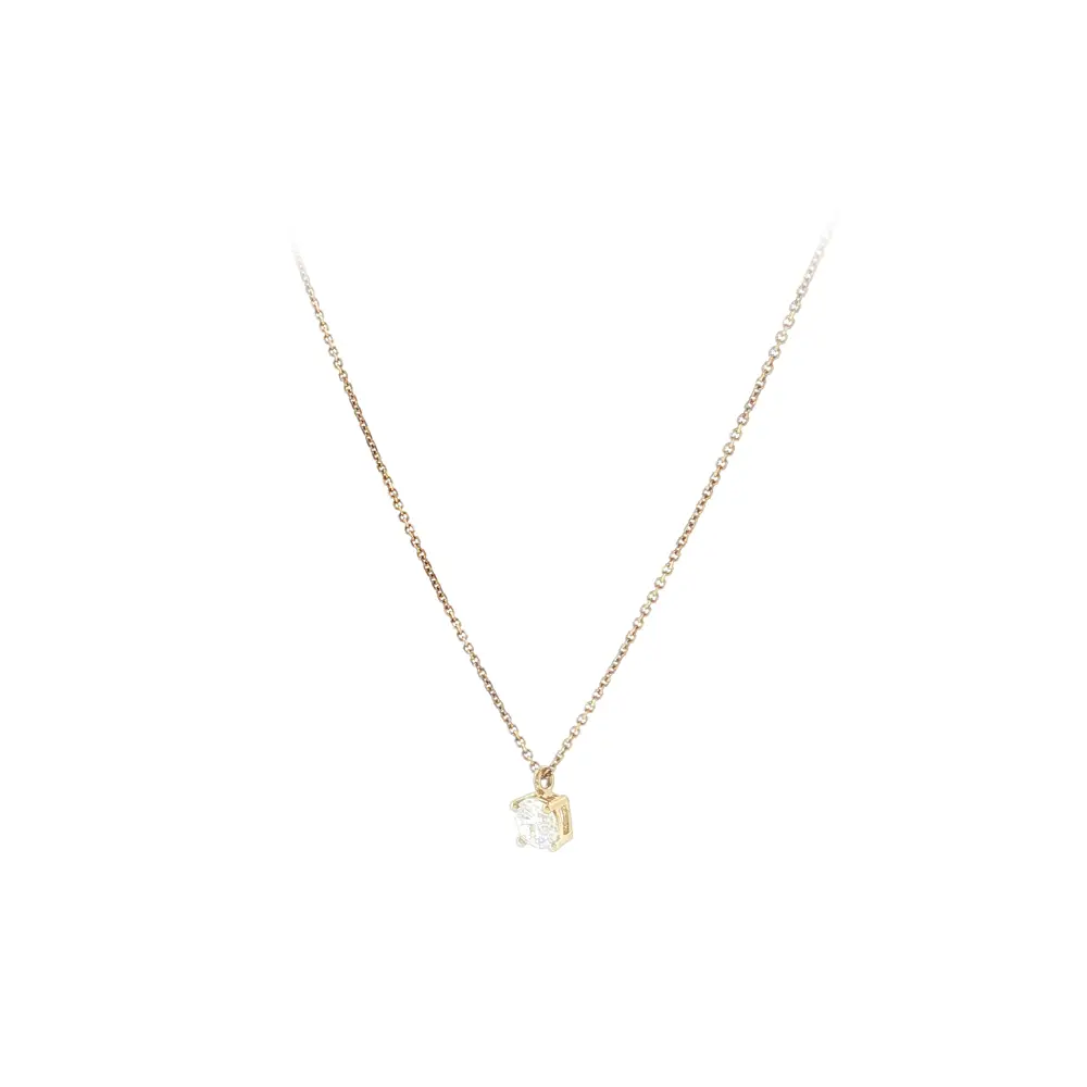 Chiếc dây chuyền vàng với đá zircon đơn nổi bật với thiết kế tối giản và vẻ lấp lánh nhẹ nhàng, dễ dàng kết hợp với mọi trang phục. Một viên đá được đính tinh xảo mang lại nét đẹp thanh lịch và vượt thời gian.