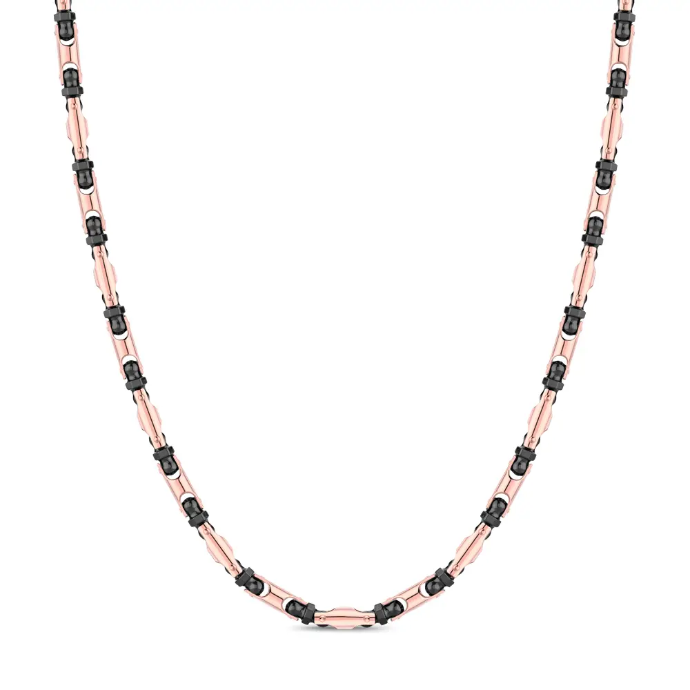 Chiếc dây chuyền độc quyền từ bộ sưu tập Ceramikgold của Zancan kết hợp vàng hồng 18K với gốm đen công nghệ cao, tạo nên sự tương phản tinh tế và phong cách hiện đại nổi bật. Mỗi mắt xích được chế tác tỉ mỉ và điểm xuyết gốm, mang đến vẻ đẹp năng động và sang trọng. Chiều dài 60 cm thể hiện đường nét sắc sảo và thiết kế kỹ thuật đặc trưng của Zancan.