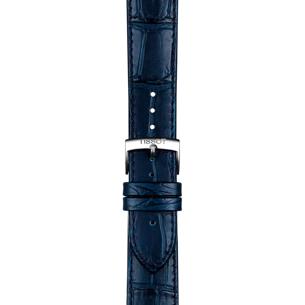 Chiếc đồng hồ đi kèm dây da họa tiết cá sấu và khóa gập cổ điển bằng thép, thể hiện sự chính xác, tinh tế và phong cách hiện đại của thương hiệu Tissot – lựa chọn hoàn hảo cho quý ông yêu sự thanh lịch.