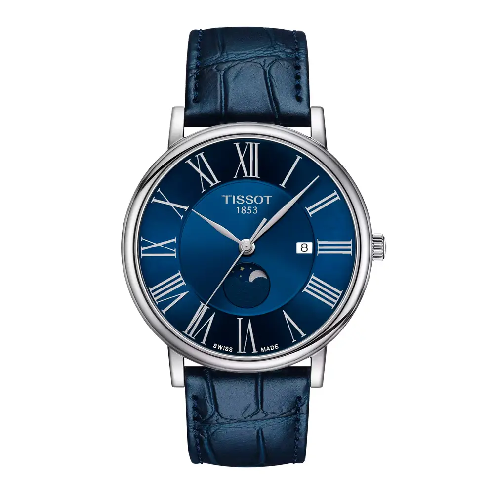 Chiếc Tissot Carson Premium Moonphase là sự hòa quyện giữa vẻ thanh lịch vượt thời gian và tay nghề chế tác đồng hồ Thụy Sĩ tinh xảo. Vỏ 40 mm bằng thép không gỉ 316L được đánh bóng tinh tế, kết hợp mặt số xanh navy với chữ số La Mã và lịch tuần trăng tại vị trí 6 giờ, mang đến nét lãng mạn và trang nhã.