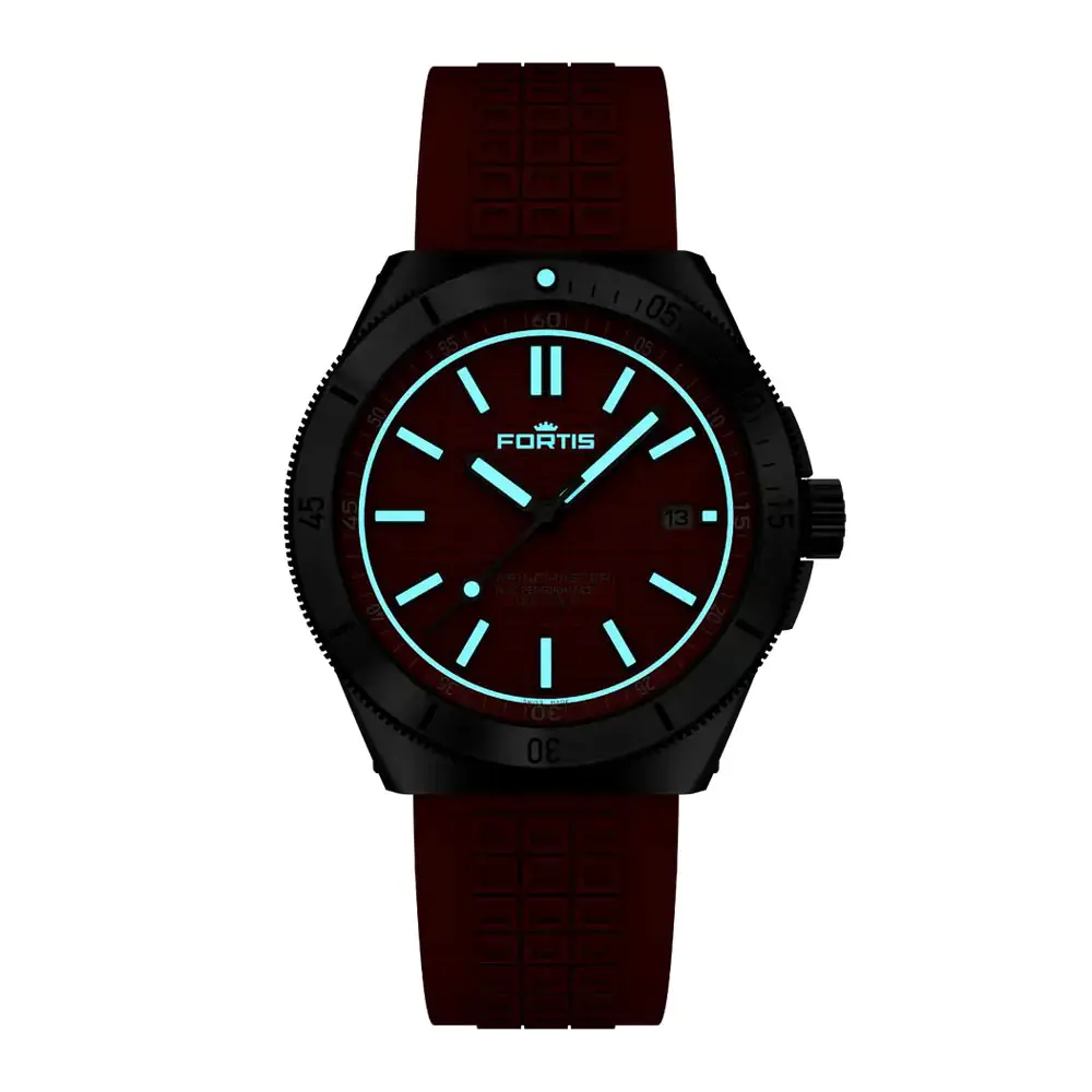 Bên trong là bộ máy tự động Fortis UW-30 Performance, phát triển từ calibre Sellita SW200-1. Bộ máy hoạt động với tần số 28.800 dao động mỗi giờ (4 Hz) và cung cấp dự trữ năng lượng khoảng 38 giờ. Đồng hồ có hiển thị ngày tại vị trí 3 giờ, trong khi mặt số được bảo vệ bởi kính sapphire chống trầy xước với lớp phủ chống phản chiếu hai mặt.