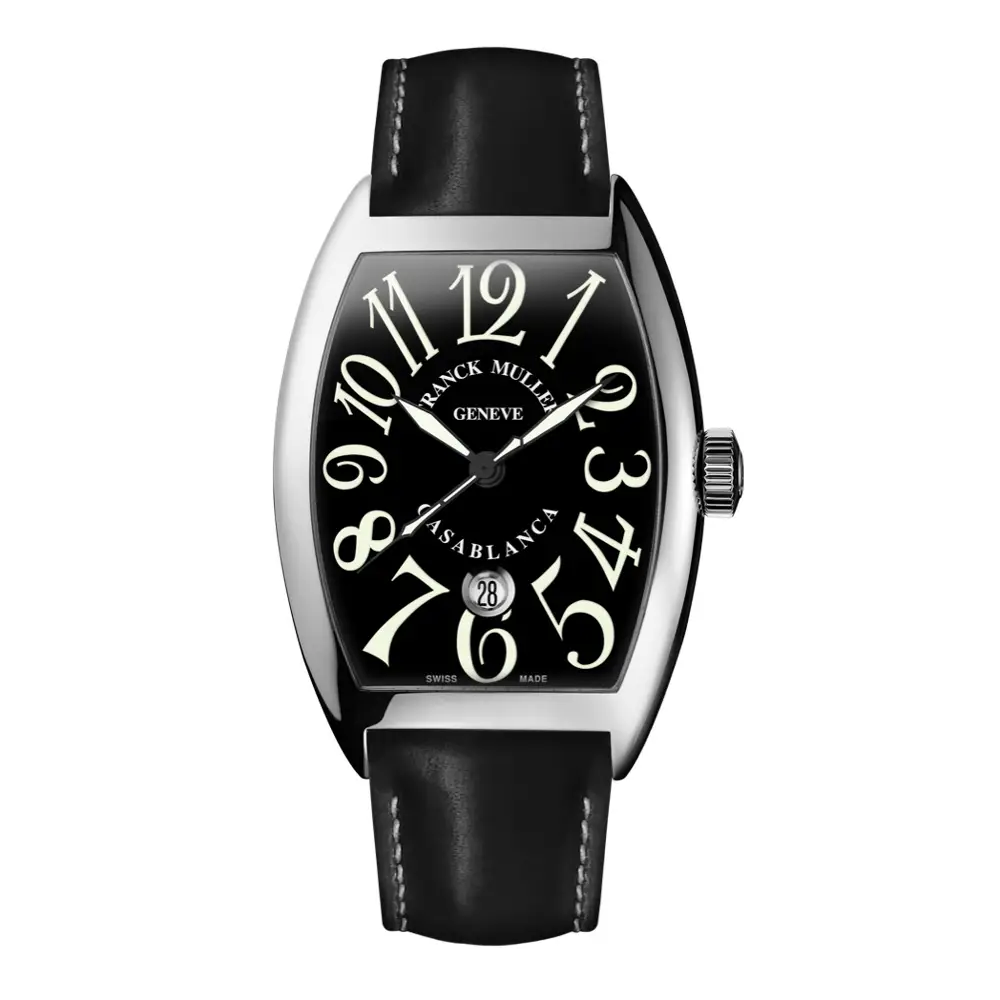 Casablanca là một trong những thiết kế kinh điển giàu cá tính nhất của Franck Muller — kết hợp sự thanh lịch tự nhiên, hơi hướng Art Deco và nét “cinematic” gợi cảm hứng du lịch cùng phong cách đô thị. Mặt số đen mờ với kiểu chữ đặc trưng cho khả năng đọc rõ ràng, trong khi lịch ngày tại vị trí 6 giờ hòa nhập trọn vẹn vào bố cục.