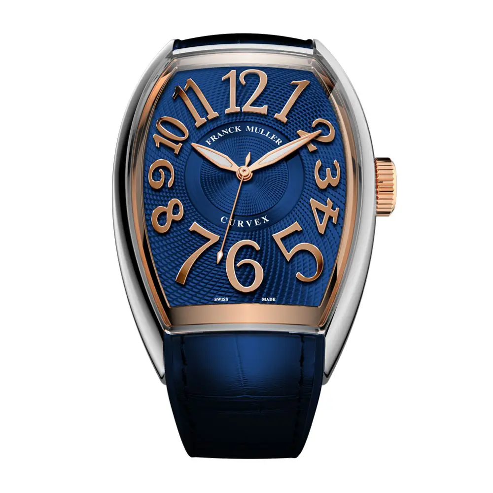 Curvex CX thể hiện ngôn ngữ thiết kế đặc trưng của Franck Muller — dáng tonneau cong mềm, chữ số nổi và tư duy kiến trúc về ánh sáng và tỷ lệ. Ở phiên bản AC / 5N, mẫu đồng hồ mang hiệu ứng hai tông (thép không gỉ + vàng hồng 18K 5N), kết hợp cùng mặt số màu xanh với họa tiết Clous de Paris tạo chiều sâu và độ phản chiếu tinh tế. Chữ số nổi và kim 5N hoàn thiện vẻ sang trọng và tiết chế.