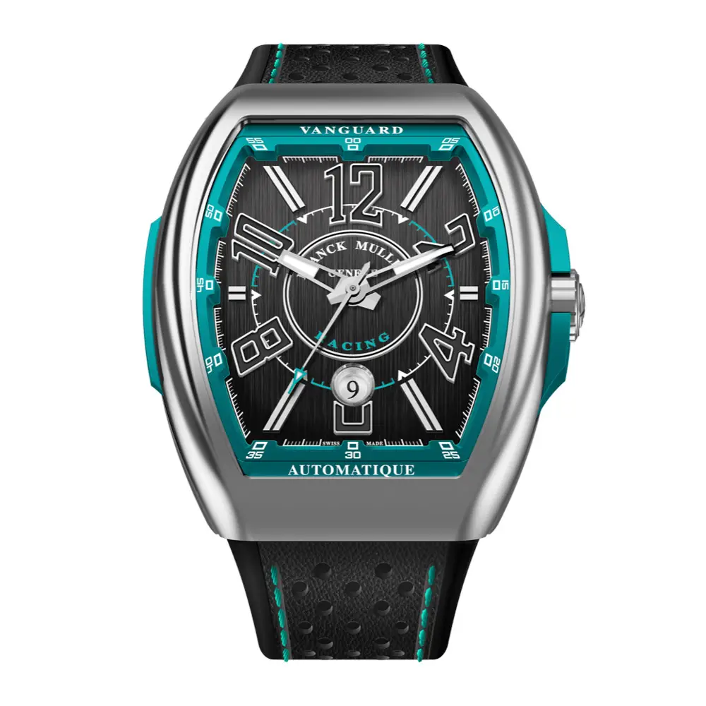Mẫu Franck Muller Vanguard Racing với chi tiết màu xanh ngọc mang đến vẻ hiện đại, kỹ thuật và đầy năng lượng. Lấy cảm hứng từ thế giới motorsport, mặt số sử dụng chữ số nổi, sơn phủ nhiều lớp và màu sắc tương phản tạo nên diện mạo mạnh mẽ.