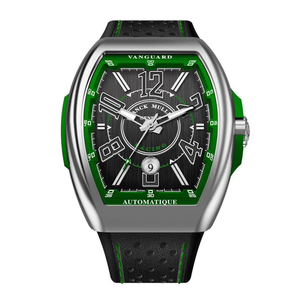 Franck Muller Vanguard Racing mang tinh thần đậm chất thể thao, lấy cảm hứng từ thiết kế xe đua và hiệu năng cao. Dáng vỏ tonneau đặc trưng cùng tỷ lệ hiện đại tạo nên phong thái vừa thanh lịch vừa mạnh mẽ.