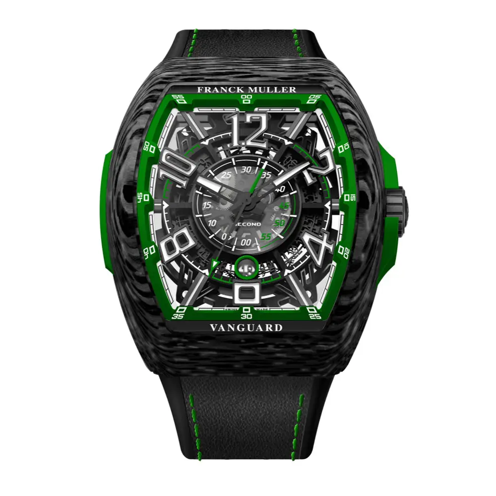 Franck Muller Vanguard Racing Skeleton Carbon Green là sự kết hợp giữa thiết kế thể thao và kỹ thuật chế tác tinh xảo. Vỏ đồng hồ bằng sợi carbon composite có kích thước 44 × 53,7 mm, vừa nhẹ vừa bền. Phần viền màu xanh lá cây tạo điểm nhấn mạnh mẽ lấy cảm hứng từ xe đua. Mặt kính sapphire chống phản chiếu và dây đeo cùng màu hoàn thiện thiết kế tổng thể mạnh mẽ.
