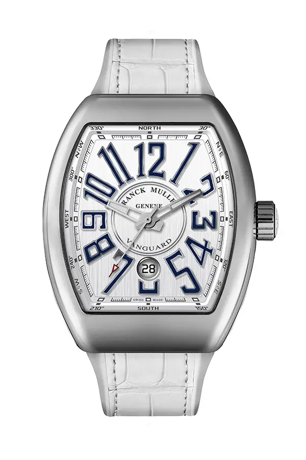 Sự kết hợp giữa màu trắng và bạc trong đồng hồ thể thao nam Frank Muller Vanguard mang đến vẻ đẹp tinh tế nhưng vẫn nổi bật. Mặt số vuông được bảo vệ bởi kính sapphire chắc chắn, nổi bật với mặt số analog đặc trưng và hiển thị ngày. Đồng hồ được cố định trên cổ tay bằng dây đeo da trắng kết hợp cao su.