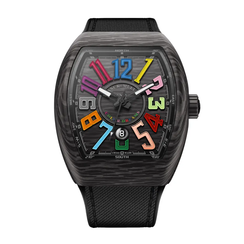 Franck Muller Vanguard V45 SC DT CARCOL DRM (NR) gây ấn tượng mạnh với thiết kế thể thao mang tính biểu tượng và công nghệ tiên tiến trong bộ vỏ siêu nhẹ, bền chắc làm từ sợi carbon cấp độ hàng không vũ trụ. Hình dáng tonneau đặc trưng kết hợp với chi tiết màu đen ở cạnh và các điểm nhấn màu sắc trên mặt số và dây đeo tạo nên một tổng thể hài hòa và hiện đại, đúng chất Vanguard.