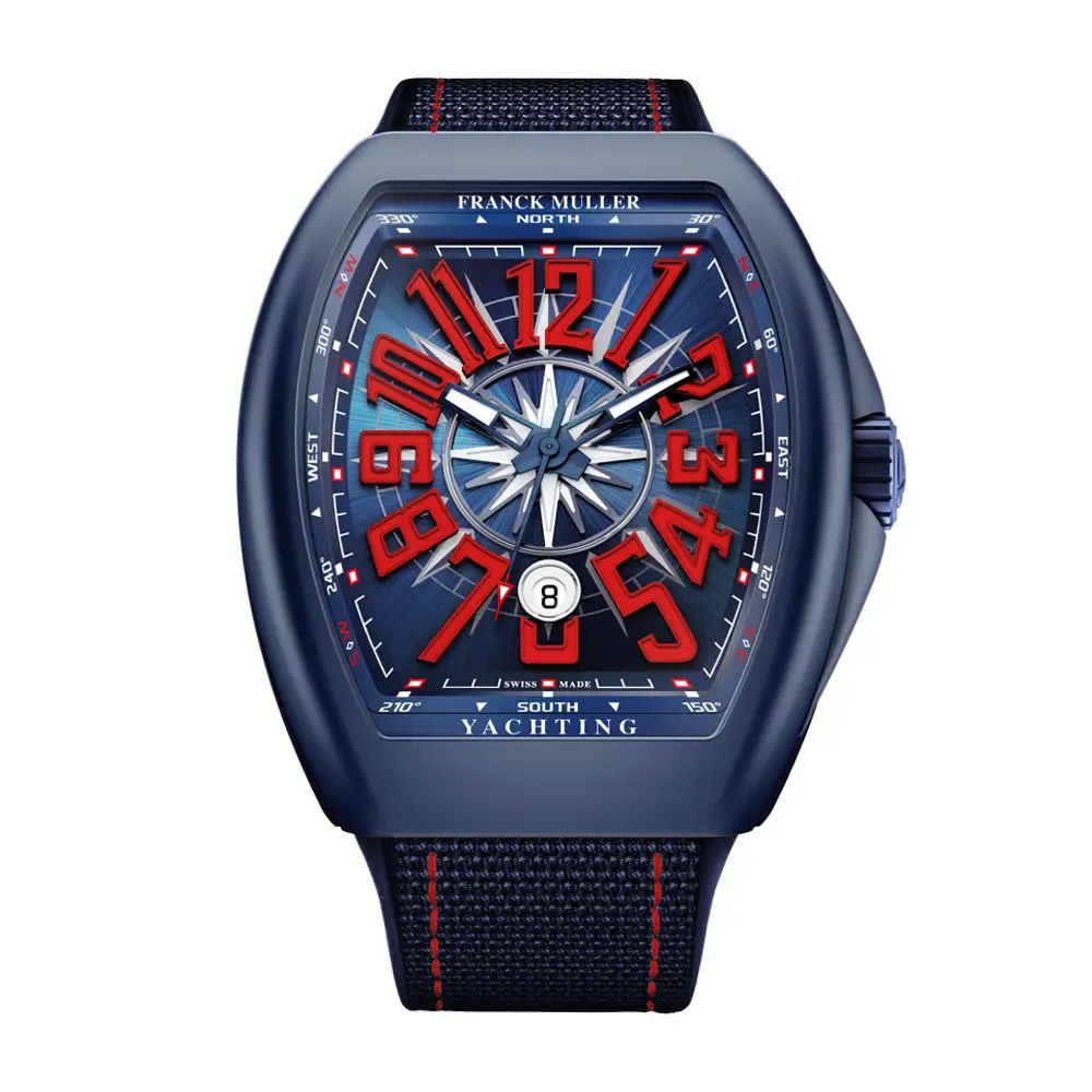 Bộ sưu tập Vanguard Yachting diễn giải phong cách Franck Muller qua cảm hứng hàng hải. Phiên bản V 45 SC DT YACHT CR BL MC (BL) nổi bật với mặt số xanh có hoa gió cùng chỉ số đỏ dạng nổi, tạo nên tương phản mạnh và khả năng đọc rõ ràng.