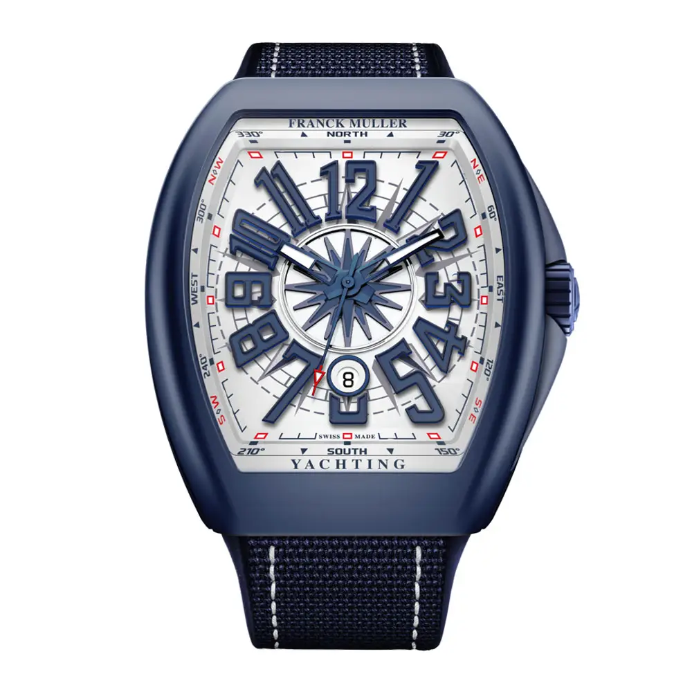 Bộ sưu tập Vanguard Yachting kết hợp phong cách Franck Muller với cảm hứng hàng hải. Phiên bản V 45 SC DT YACHT CR BL MC (BL) mang mặt số sáng với họa tiết la bàn cùng chỉ số xanh navy, tạo độ tương phản và nhận diện mạnh.