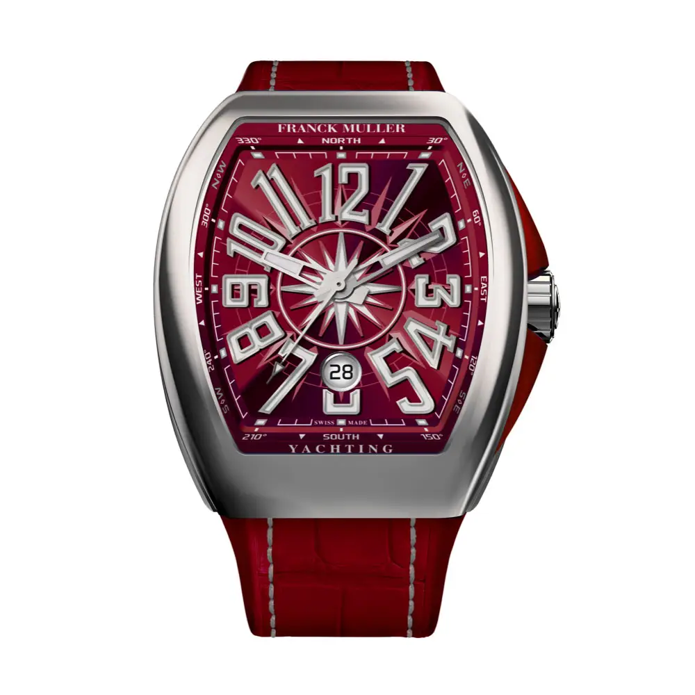 Franck Muller Vanguard Yachting V43 SC DT YACHT (BO) là sự kết hợp giữa tinh hoa chế tác đồng hồ Thụy Sĩ và cảm hứng từ hàng hải. Vỏ thép không gỉ đánh bóng kích thước 42,5 × 52,7 mm, kèm viền bên màu đỏ rượu vang tạo nên vẻ ngoài độc đáo. Mặt kính sapphire chống trầy xước và khả năng chống nước 30m lý tưởng cho sử dụng hàng ngày.