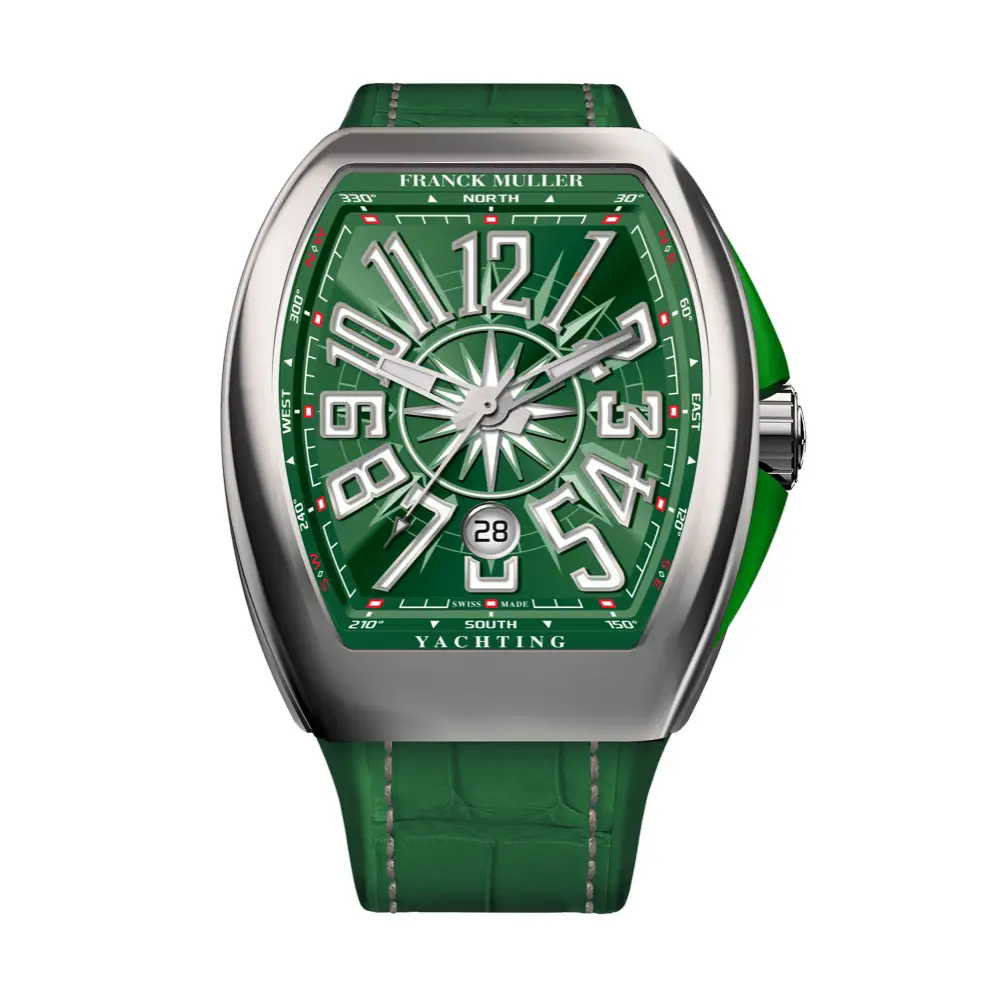 Franck Muller Vanguard Yachting V43 SC DT YACHT (VR) mang đến tinh thần hàng hải với thiết kế thể thao hiện đại. Mặt số màu xanh lá nổi bật với họa tiết la bàn và các vạch giờ phát quang tạo nên ấn tượng mạnh mẽ. Tông màu xanh lá đậm kết hợp cùng dây đeo và chi tiết bên hông hài hòa, gợi nhớ đến đại dương và tự do.