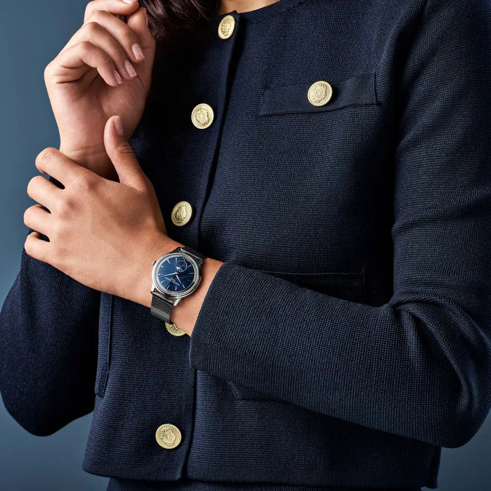 Vỏ thép không gỉ đường kính 37 mm có thiết kế mỏng, mang lại cảm giác thoải mái trên cổ tay. Kính sapphire phủ chống phản chiếu giúp tăng khả năng chống trầy xước và đảm bảo khả năng hiển thị rõ ràng. Đồng hồ được trang bị dây thép Milanese, kết hợp hoàn hảo giữa sự thoải mái và vẻ ngoài sang trọng.