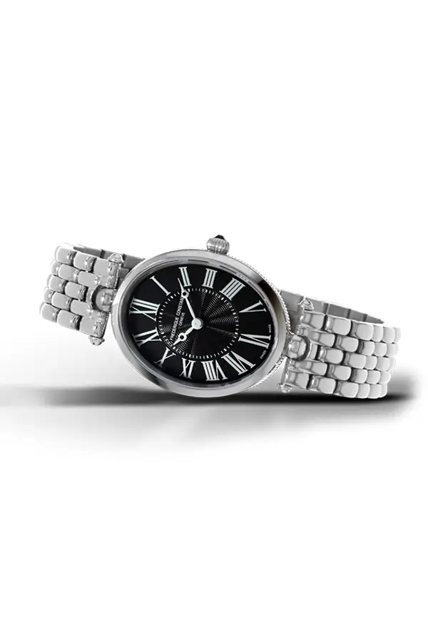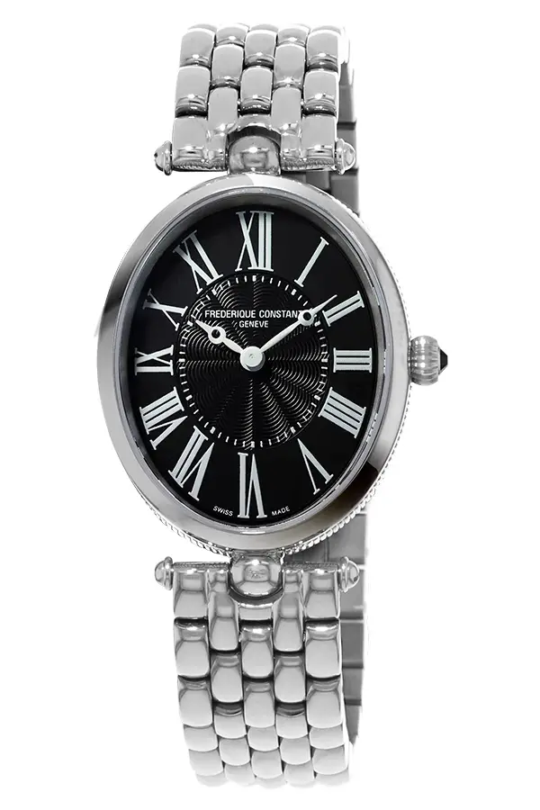 Frédérique Constant Classics Art Deco FC-200MPB2V6B là mẫu đồng hồ nữ thanh lịch, lấy cảm hứng từ phong cách cổ điển thập niên 1920. Vỏ thép không gỉ hình oval (25 × 30 mm) mang lại vẻ nhẹ nhàng và tinh tế, trong khi mặt số màu đen với chữ số La Mã tạo nên phong thái vượt thời gian. Kính sapphire chống trầy xước, bảo vệ mặt số hiệu quả.
