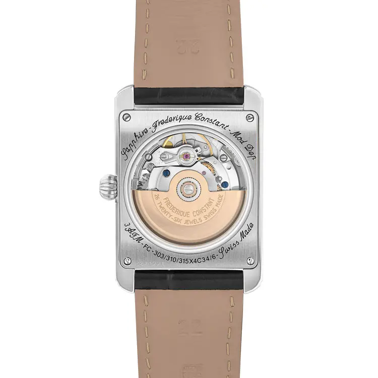 Bên dưới lớp kính sapphire là bộ máy tự động FC-311, với dự trữ năng lượng khoảng 38 giờ, không chỉ đáng tin cậy mà còn ấn tượng về mặt thị giác nhờ thiết kế mở một phần. Dây da màu đen với khóa cài truyền thống hoàn thiện thiết kế tổng thể và mang lại sự thoải mái khi đeo.