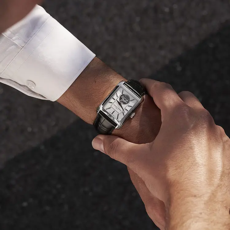 Frédérique Constant Classics Carrée Heart Beat FC-311S4C6 là sự kết hợp hài hòa giữa phong cách cổ điển và nghệ thuật chế tác đồng hồ hiện đại. Mẫu đồng hồ nam thanh lịch này gây ấn tượng với vỏ thép không gỉ hình chữ nhật kích thước 30,4 × 33,3 mm, lấy cảm hứng từ thẩm mỹ của thập niên 1930 và mang lại vẻ ngoài tinh tế. Điểm nhấn nổi bật là ô cửa sổ “Heart Beat” trên mặt số màu bạc, cho thấy nhịp đập của bộ máy Thụy Sĩ chính xác, tượng trưng cho trái tim sống động của cơ khí.