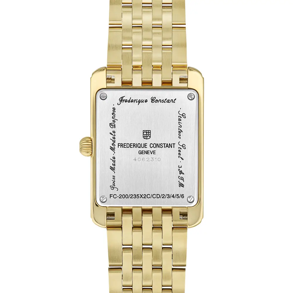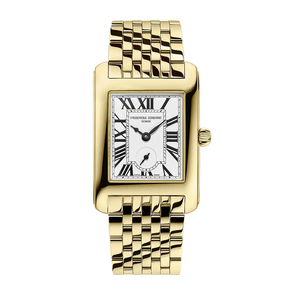 Frederique Constant Classics Carrée Small Seconds FC-235S2C5B mang đến phong cách Art Deco tinh tế trong thiết kế unisex hiện đại. Vỏ đồng hồ hình chữ nhật với lớp phủ PVD màu vàng bao quanh mặt số bạc sang trọng, sử dụng chữ số La Mã, kim thanh mảnh và ô hiển thị giây nhỏ phía trên vị trí 6 giờ. Tổng thể mang cảm giác hài hòa, thanh lịch và phù hợp cho cả trang phục hằng ngày lẫn các dịp trang trọng.