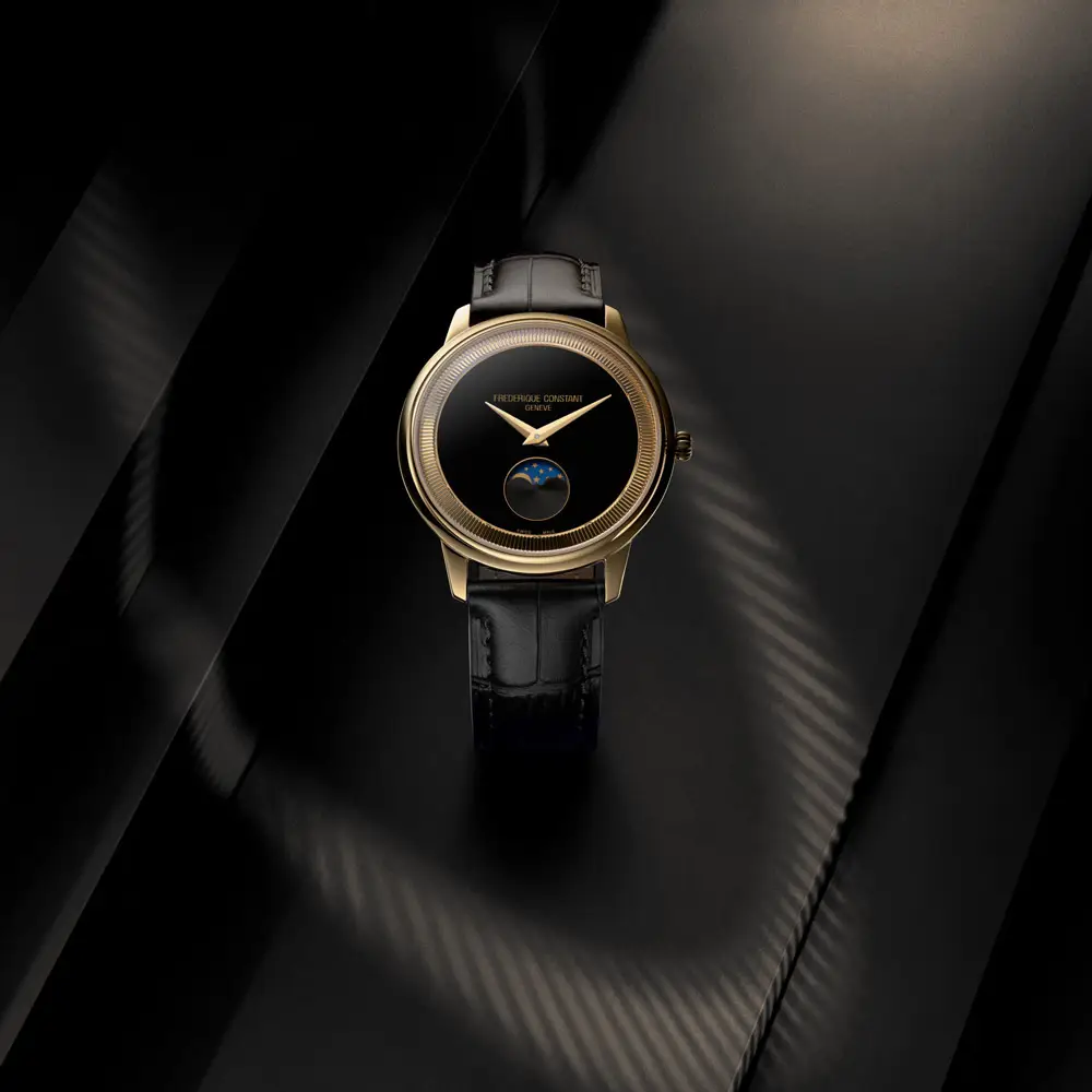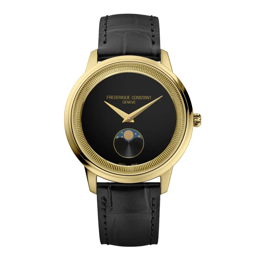 Đồng hồ Frederique Constant Classics Moneta Moonphase FC-206B3S5 thể hiện vẻ đẹp thanh lịch vượt thời gian cùng nghệ thuật chế tác Thụy Sĩ tinh xảo. Mặt số đen theo phong cách tối giản tạo nên sự tương phản nổi bật với vỏ đồng hồ tông vàng, trong khi chức năng lịch tuần trăng tại vị trí 6 giờ mang đến nét thi vị và cuốn hút. Thiết kế cân đối giúp đồng hồ phù hợp cho cả sử dụng hằng ngày lẫn những dịp trang trọng.
