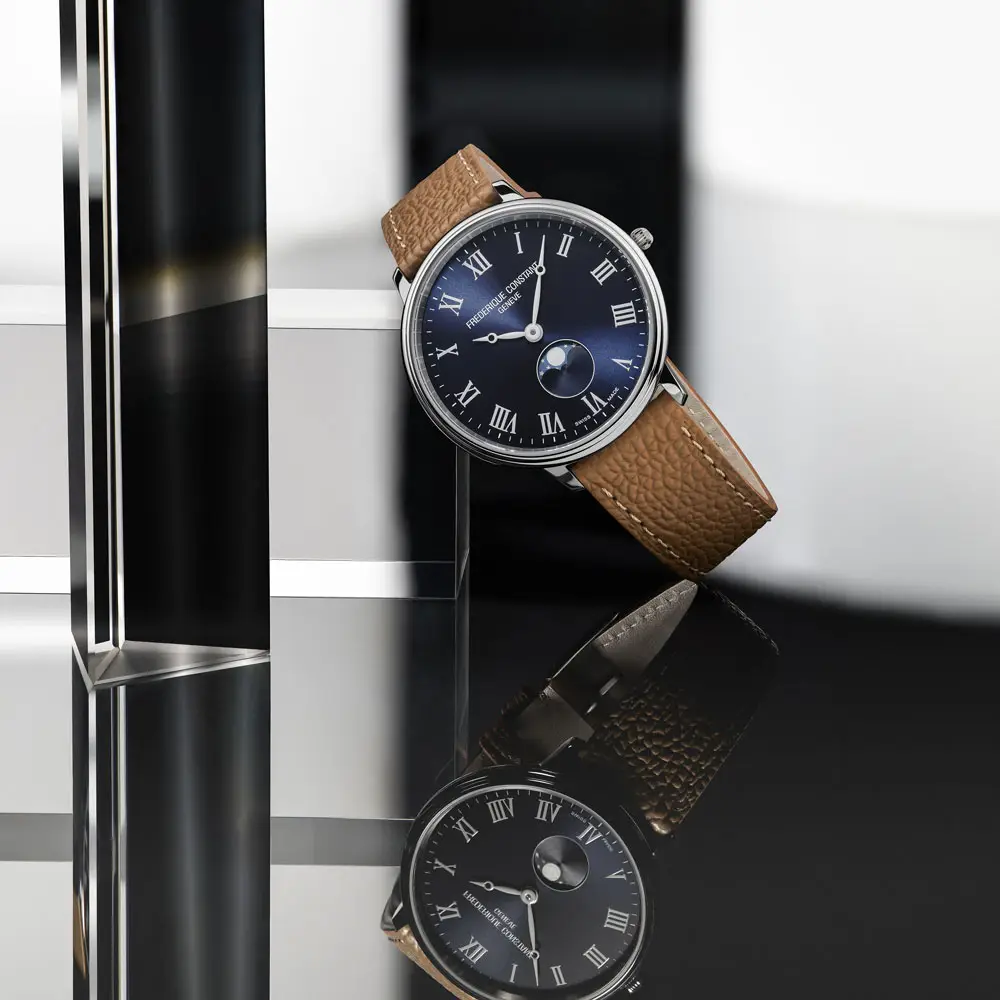 Đồng hồ Frederique Constant Classics Quartz Moonphase là sự kết hợp hài hòa giữa vẻ đẹp cổ điển và độ chính xác của nghệ thuật chế tác Thụy Sĩ. Vỏ thép không gỉ 39 mm có tỷ lệ cân đối, phù hợp cho cả nam và nữ, trong khi mặt số xanh đậm với chữ số La Mã mang lại phong cách thanh lịch và vượt thời gian.
