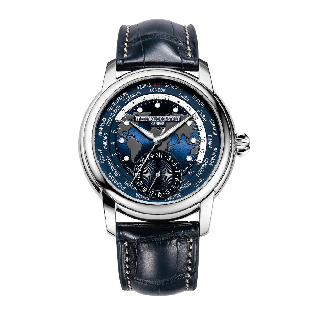 Chiếc Frederique Constant Worldtimer Manufacture thể hiện sự tinh tế của nghệ thuật chế tác đồng hồ Thụy Sĩ kết hợp với phong cách du lịch hiện đại. Vỏ đồng hồ thép không gỉ 42 mm cùng mặt kính sapphire bảo vệ mặt số màu xanh lam khắc bản đồ thế giới – biểu tượng của tầm nhìn toàn cầu.