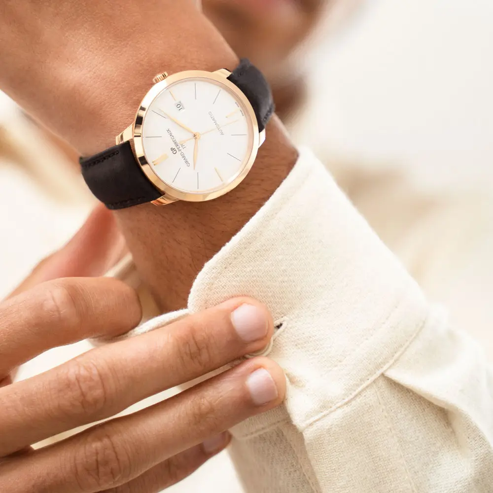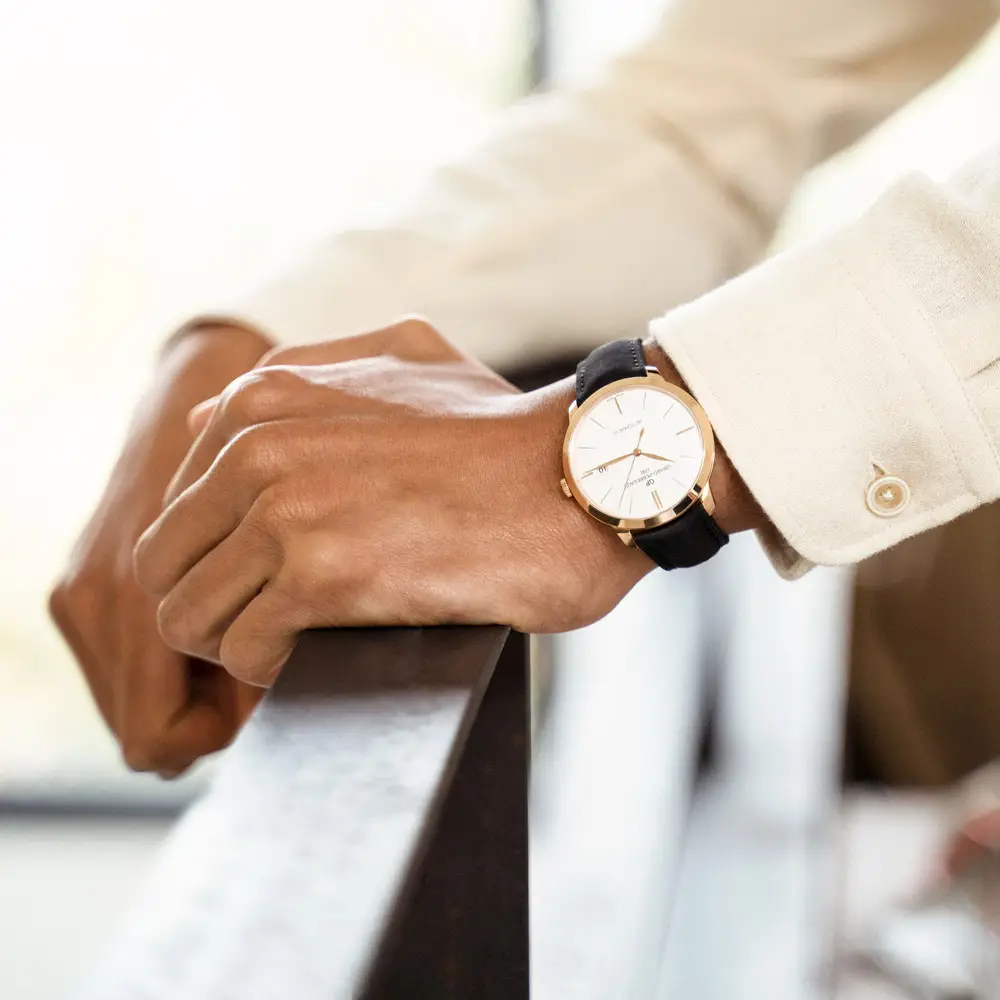 Dây đeo da cá sấu màu đen với khóa chốt cổ điển làm nổi bật nét sang trọng của mẫu này và mang lại sự thoải mái khi đeo. Đồng hồ có khả năng chống nước 3 ATM (30 mét), bảo vệ chống ẩm thông thường, lý tưởng cho sử dụng hàng ngày.