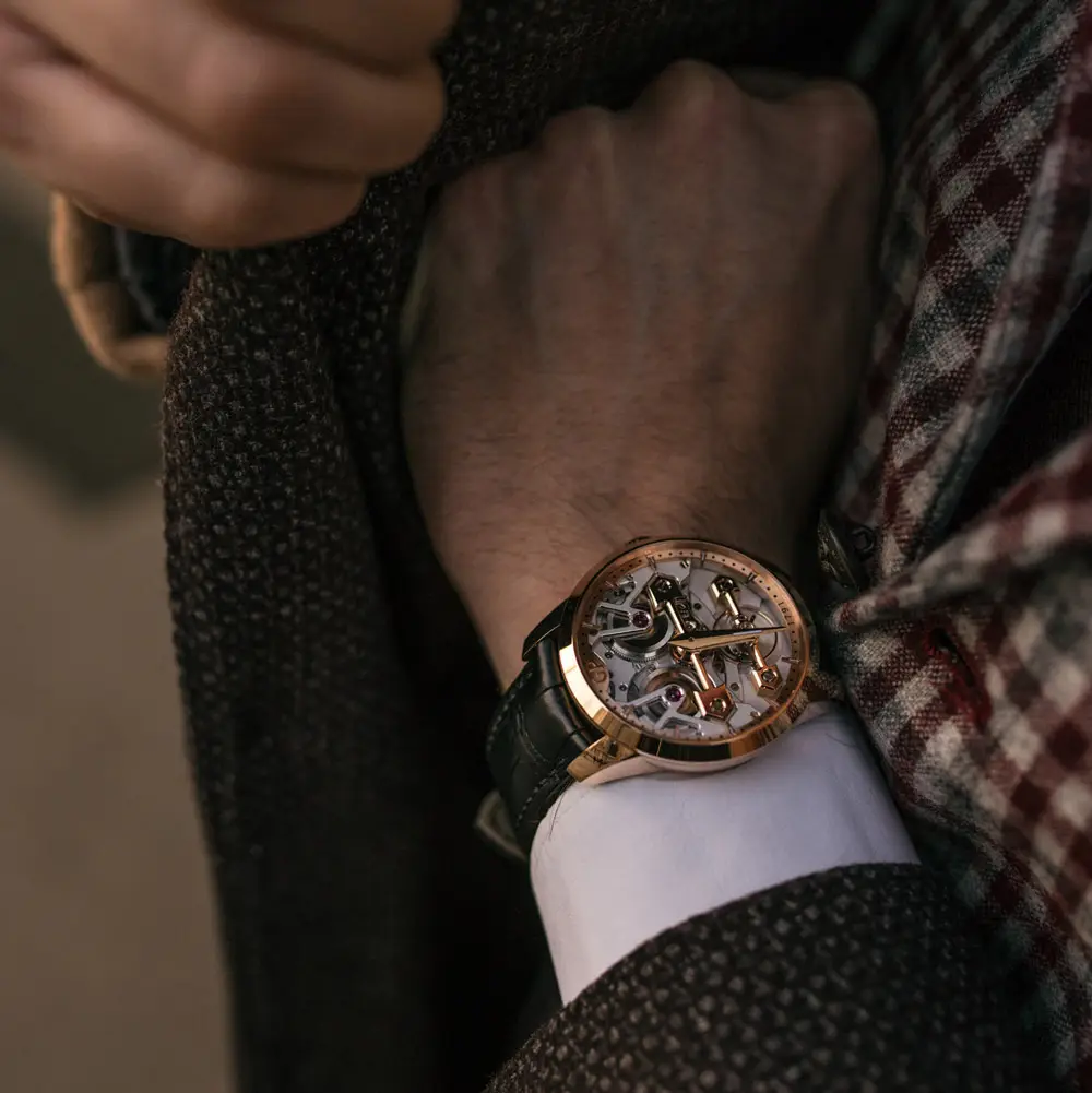 Hoàn thiện với dây da cá sấu đen và khóa gập vàng hồng, đồng hồ có khả năng chống nước 30 m (3 bar). Classic Bridges dành cho những ai trân trọng sự thanh lịch, độc quyền và tinh xảo kỹ thuật.