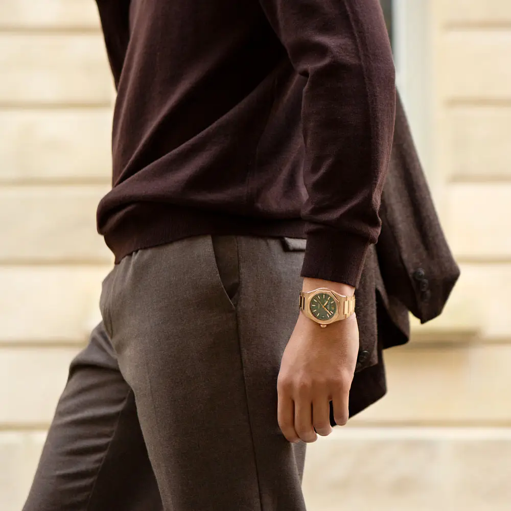 Bên dưới mặt kính sapphire bền bỉ là mặt số analog màu xanh lá nổi bật, mang đến nét hiện đại và tươi mới, kết hợp với lịch ngày tiện dụng ở vị trí truyền thống. Bên trong là bộ máy cơ tự động Caliber GP01800 chính xác, cung cấp dự trữ năng lượng khoảng 54 giờ, tần số cao 28.800 dao động/giờ (4 Hz), đảm bảo độ chính xác và độ tin cậy vượt trội.