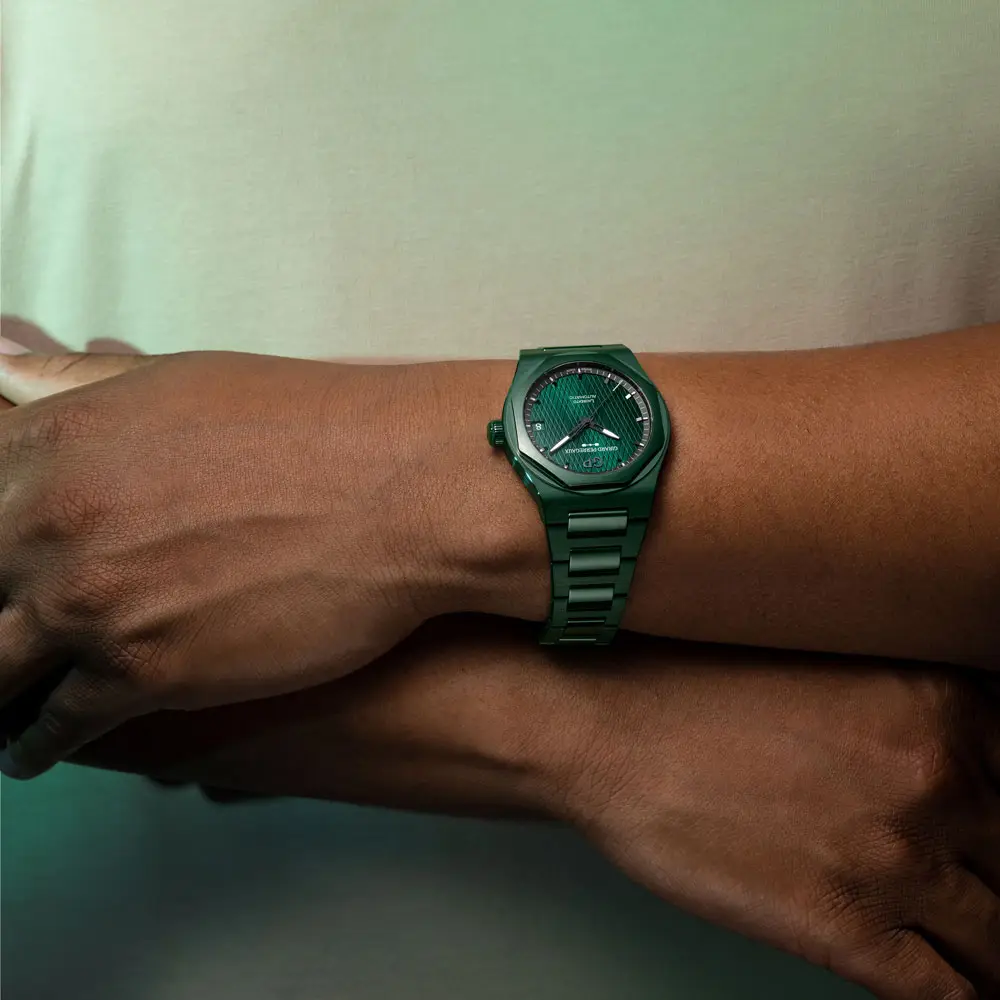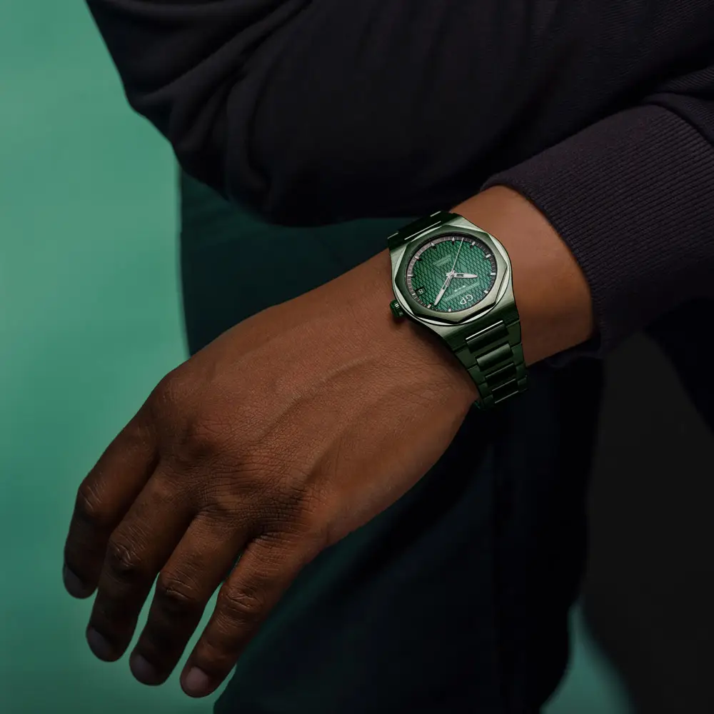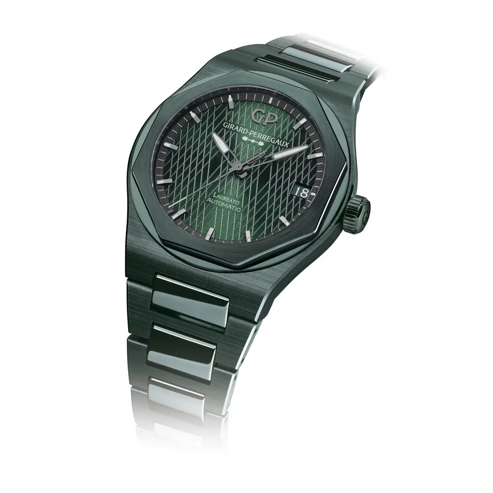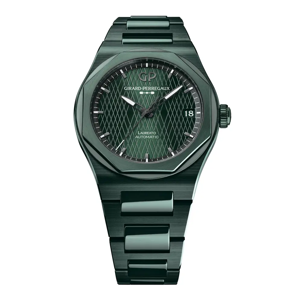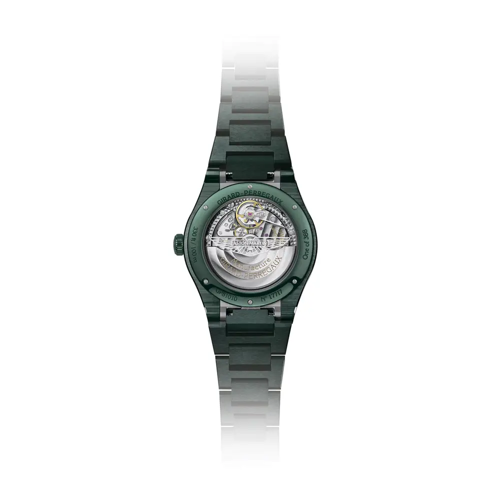 Đồng hồ Girard-Perregaux Laureato 42 mm Green Ceramic Aston Martin Edition kết hợp hoàn hảo giữa độ chính xác Thụy Sĩ, phong cách Anh quốc và tinh thần đua xe thể thao. Vỏ gốm xanh 42 mm với vành bezel bát giác đặc trưng tôn lên vẻ đẹp thể thao và tinh tế của phiên bản hợp tác đặc biệt này.