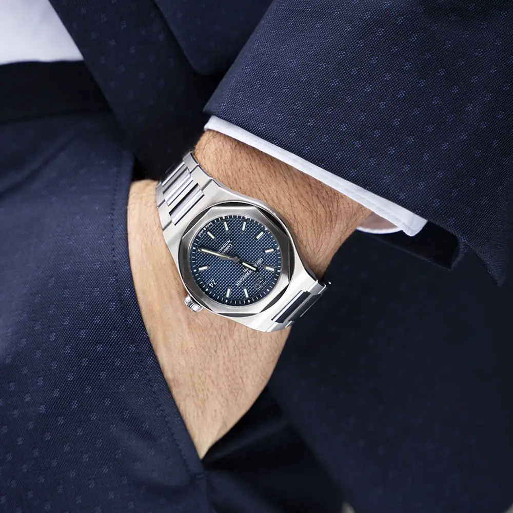 Đồng hồ Girard-Perregaux Laureato 42mm gây ấn tượng với thiết kế tinh giản, kết hợp giữa phong cách thể thao và sự thanh lịch Thụy Sĩ. Vỏ tròn đường kính 42 mm được chế tác từ thép không gỉ bền bỉ, cùng với vành bezel thép và dây đeo thép bạc tích hợp với khóa gập tiện lợi và thoải mái.