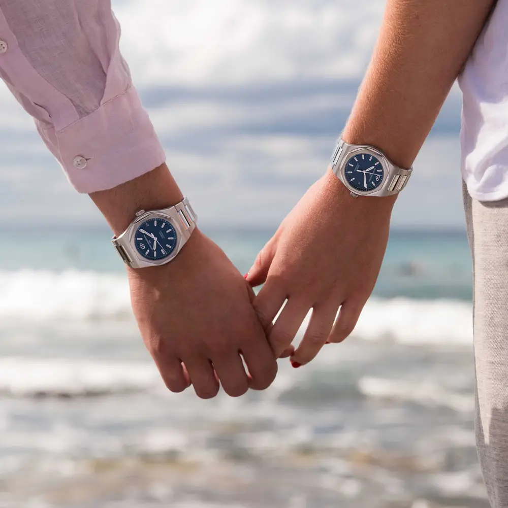 Bên dưới mặt kính sapphire bền bỉ là mặt số analog màu xanh thu hút, có tính dễ đọc cao, đi kèm lịch ngày tiện dụng ở vị trí truyền thống. Nhờ khả năng chống nước 10 ATM (100 mét), đồng hồ phù hợp không chỉ để đeo hàng ngày mà còn cho bơi lội và lối sống năng động.