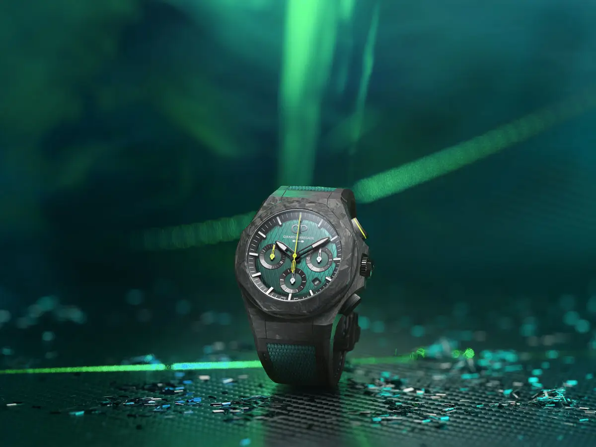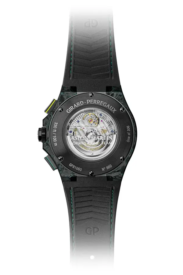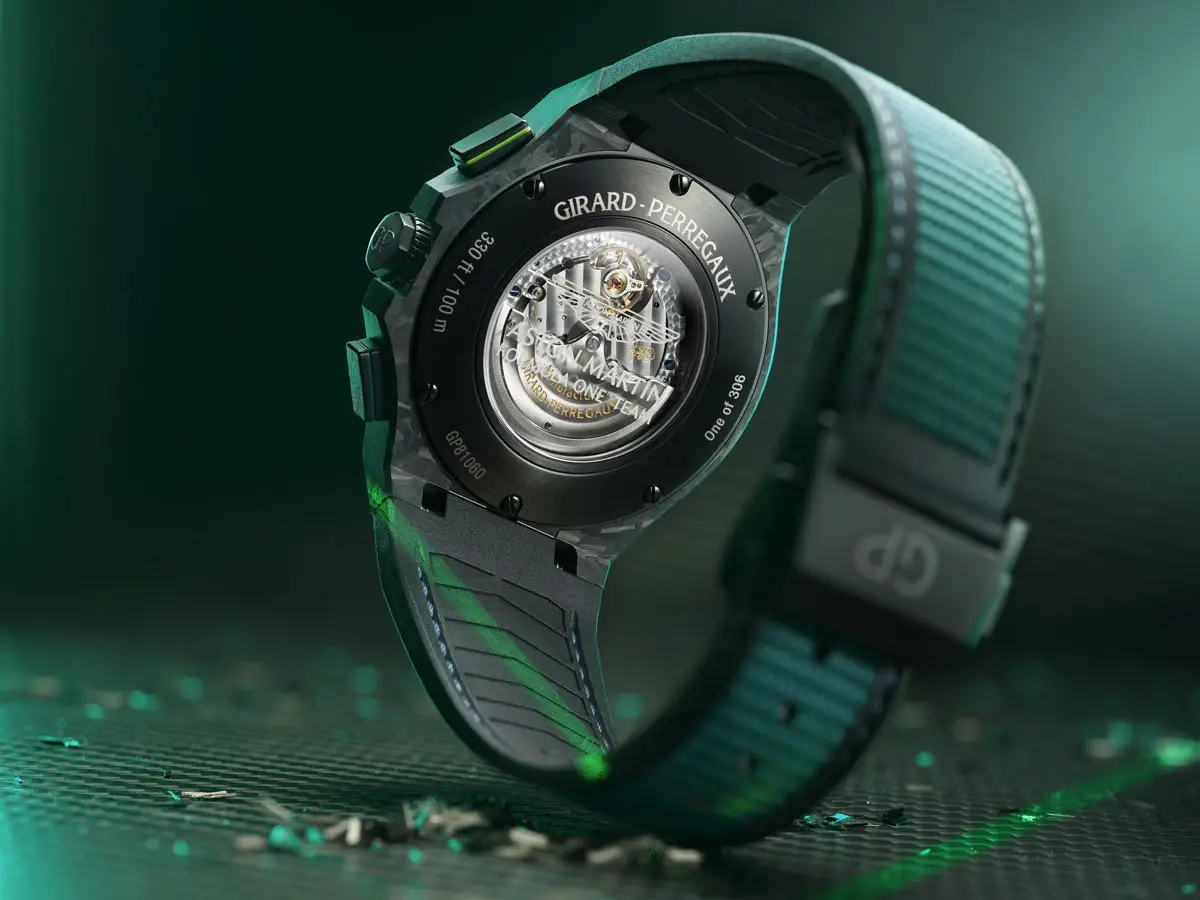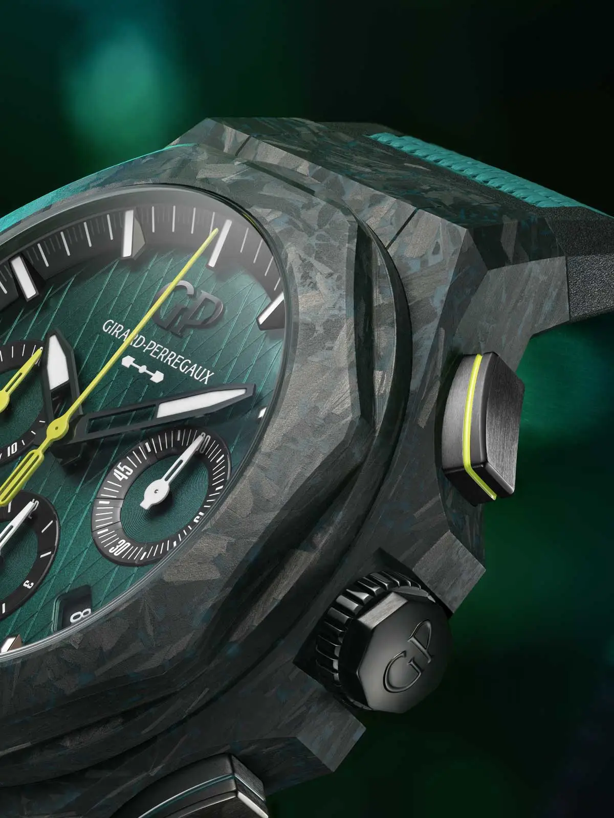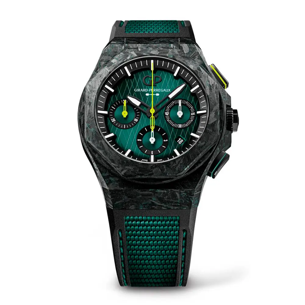 Đồng hồ Girard-Perregaux Laureato Absolute Chronograph Aston Martin F1 Edition kết hợp nghệ thuật chế tác Thụy Sĩ và tinh thần đua xe F1 trong phiên bản giới hạn 306 chiếc. Vỏ titan-carbon 44 mm chứa sợi carbon từ xe đua Aston Martin F1 mùa giải 2021, thể hiện sự độc đáo về công nghệ và phong cách thể thao mạnh mẽ.