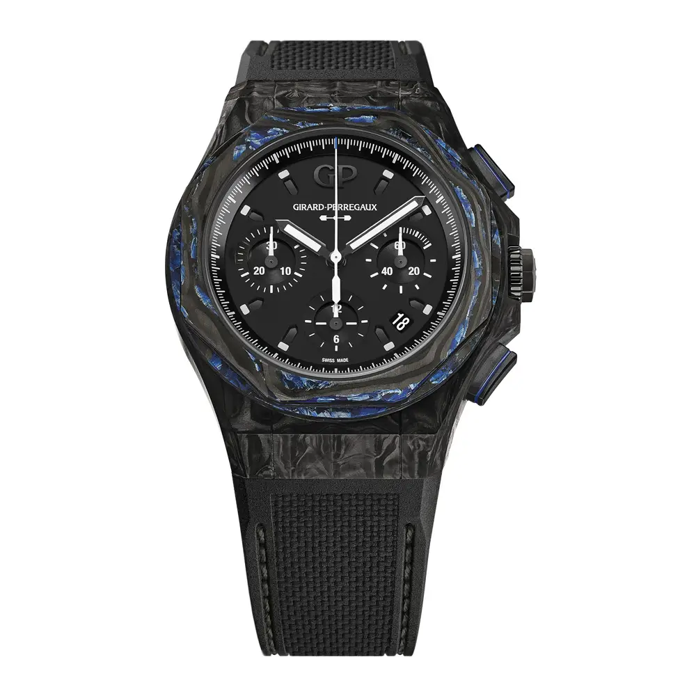 Vỏ carbon 44 mm cùng vành bezel bằng carbon mang lại vẻ mạnh mẽ, hiện đại. Mặt số đen với điểm nhấn xanh dương và mặt phụ chronograph tạo cảm giác năng động, trong khi kính sapphire chống phản chiếu giúp bảo vệ hoàn hảo. Khả năng chống nước 50 m (5 ATM) phù hợp với sinh hoạt hàng ngày.