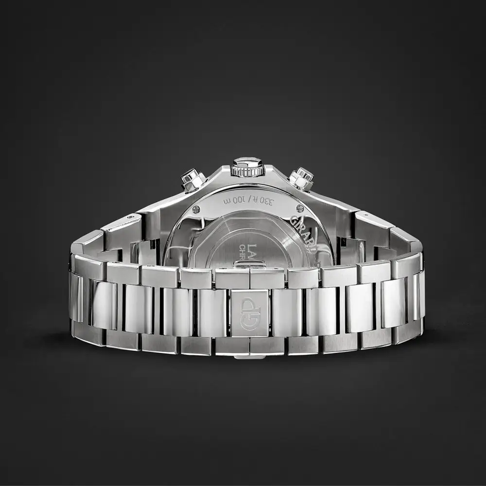 Đồng hồ Girard-Perregaux Laureato Chronograph là hiện thân hoàn hảo của phong cách thể thao thanh lịch và tay nghề Thụy Sĩ chính xác. Vỏ tròn đường kính 42 mm được làm từ thép không gỉ chất lượng cao và được bảo vệ bởi mặt kính sapphire bền bỉ, đảm bảo khả năng đọc rõ ràng và chống trầy xước.