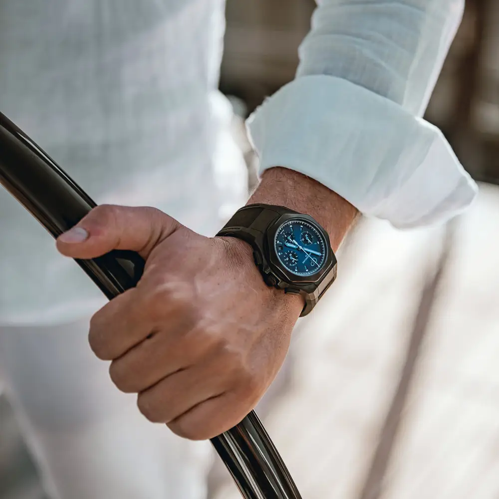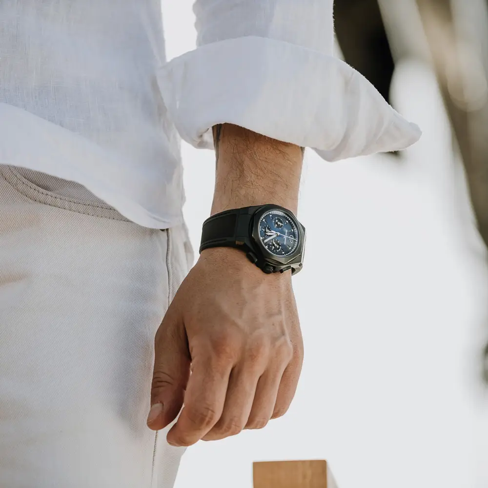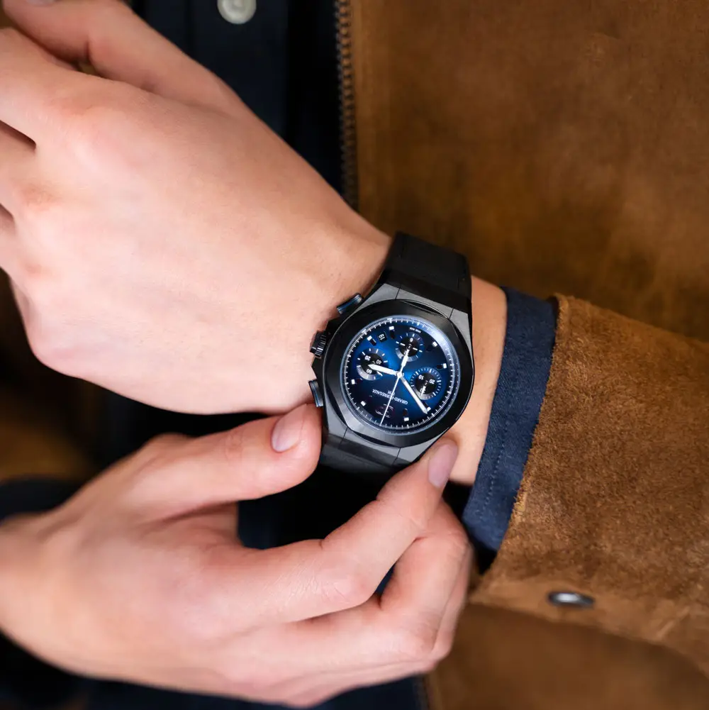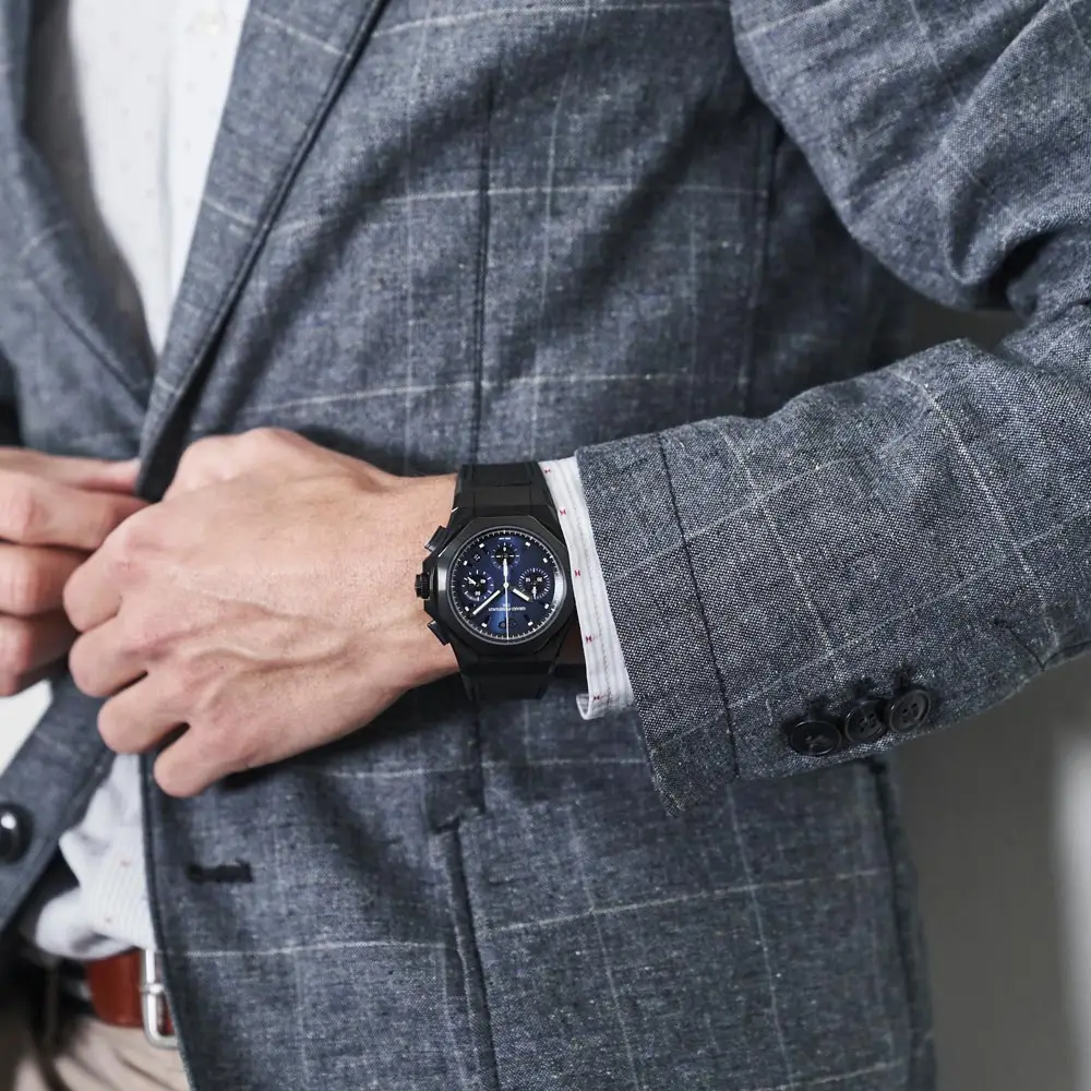 Bên dưới mặt kính sapphire là mặt số analog màu xanh cuốn hút, cung cấp chức năng chronograph và lịch ngày tiện dụng, lý tưởng cho phong cách sống năng động. Với khả năng chống nước 30 ATM (300 mét), đồng hồ sẵn sàng cho điều kiện khắc nghiệt và sử dụng chuyên nghiệp dưới nước.
