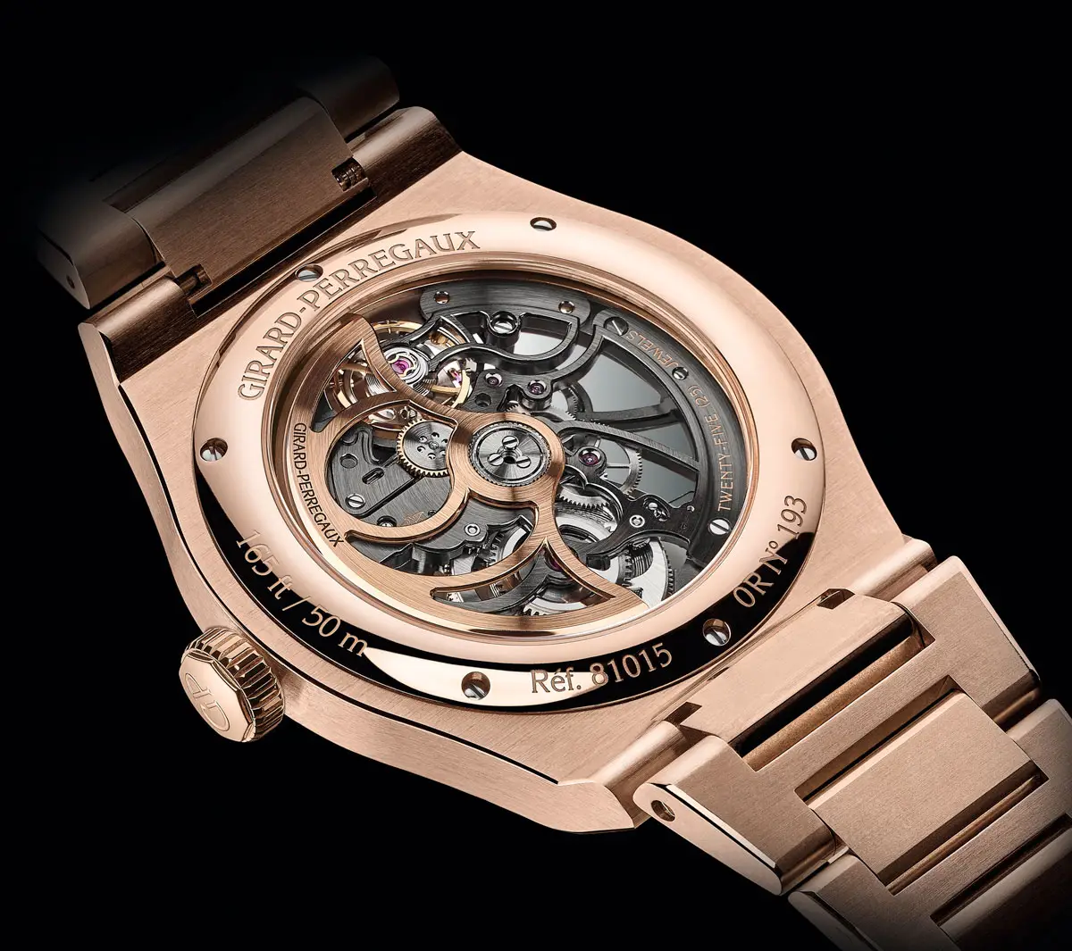 Vỏ vàng hồng 18K đường kính 42 mm cùng vành bezel bát giác đặc trưng và dây đeo liền khối tạo nên tổng thể hài hòa và sang trọng. Kính sapphire chống phản chiếu để lộ mặt số skeleton ấn tượng, cho phép chiêm ngưỡng cấu trúc bên trong. Với khả năng chống nước 100 m (10 ATM), đồng hồ vừa bền bỉ vừa tinh tế.