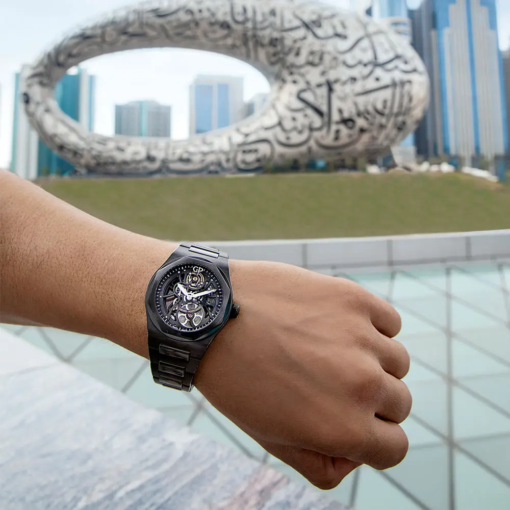 Đồng hồ đi kèm dây gốm liền mạch với khóa gập ba và khả năng chống nước 100 m (10 bar). Laureato Skeleton Ceramic dành cho những ai yêu thích sự đổi mới, phong cách mạnh mẽ và vẻ đẹp đương đại.