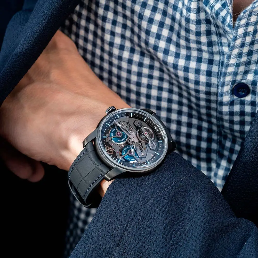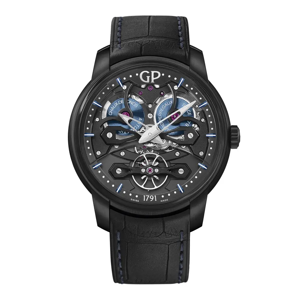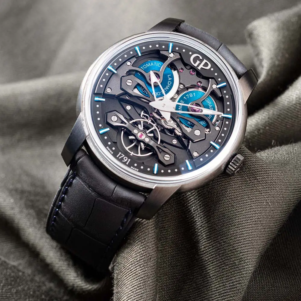 Đồng hồ Girard-Perregaux Neo Bridges Earth to Sky Edition là sự kết hợp hoàn hảo giữa vẻ đẹp hiện đại và truyền thống chế tác đồng hồ Thụy Sĩ. Vỏ titan 45 mm phủ DLC đen mang thiết kế tương lai với mặt số skeleton điểm xanh lam, biểu trưng cho sự giao hòa giữa đất và trời.