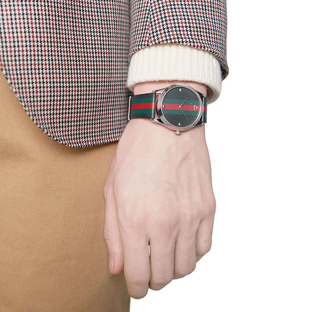 Gucci G-Timeless YA1264079 kết hợp thẩm mỹ hiện đại với các chi tiết biểu tượng của hãng. Trên cổ tay là vỏ tròn 38 mm bằng thép, kính sapphire và mặt số analog hai tông (bicolor) mang vẻ ngoài tối giản, dễ phối cùng phong cách hằng ngày lẫn trang trọng.