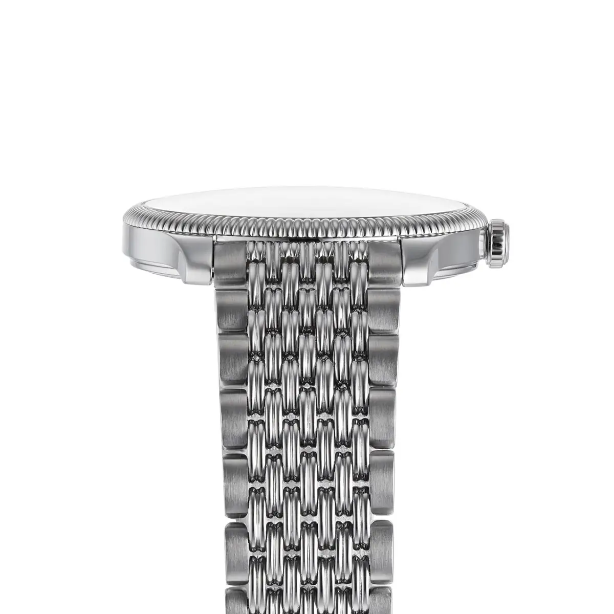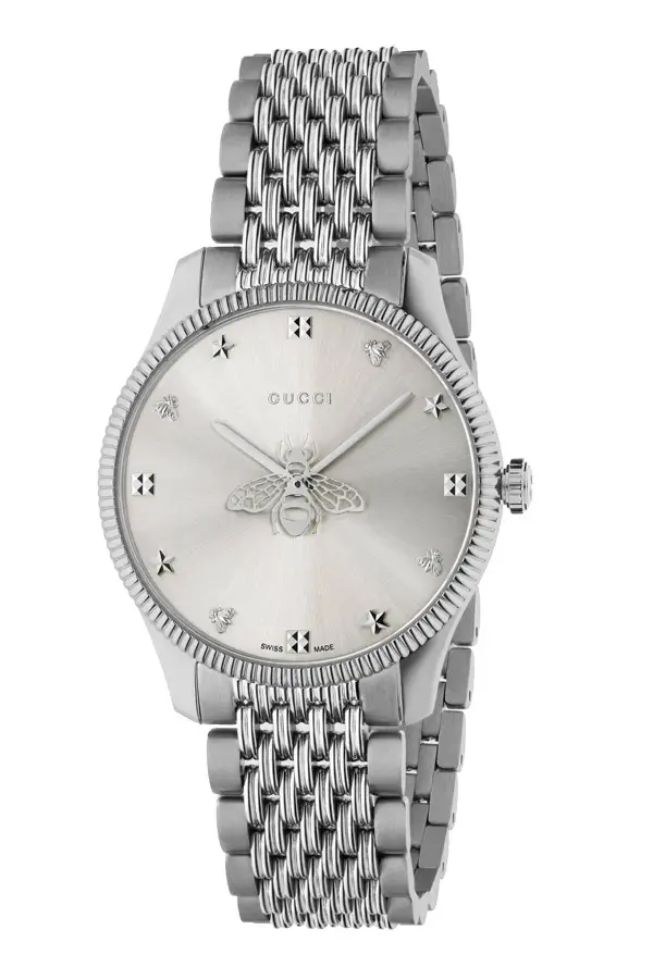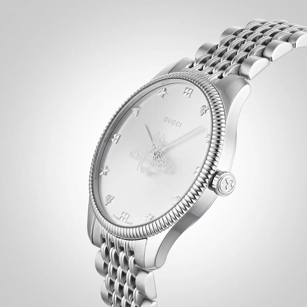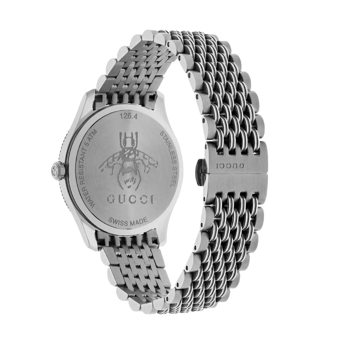 Gucci G-Timeless YA1264153 kết hợp thiết kế tinh gọn với dấu ấn đặc trưng của hãng. Trên cổ tay là vỏ tròn 36 mm bằng thép không gỉ, kính sapphire và vành bezel thép tinh gọn. Mặt số analog màu bạc cùng dây thép (tông bạc) kèm khóa gập tạo nên tổng thể nhỏ gọn, vượt thời gian cho mỗi ngày.