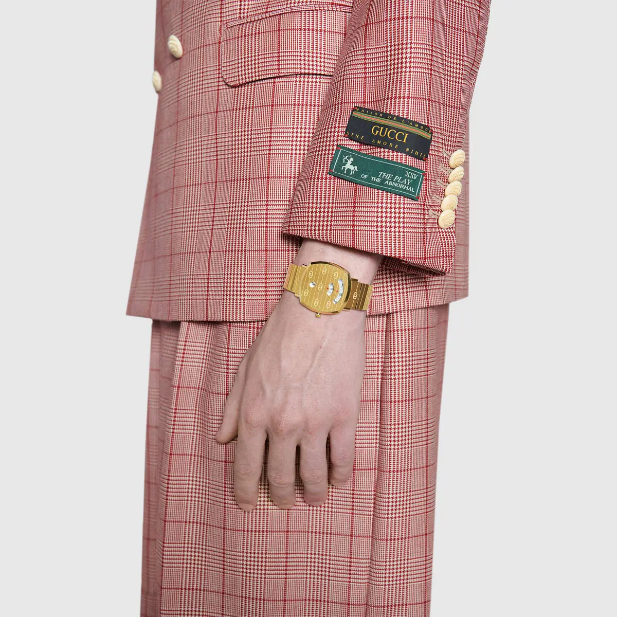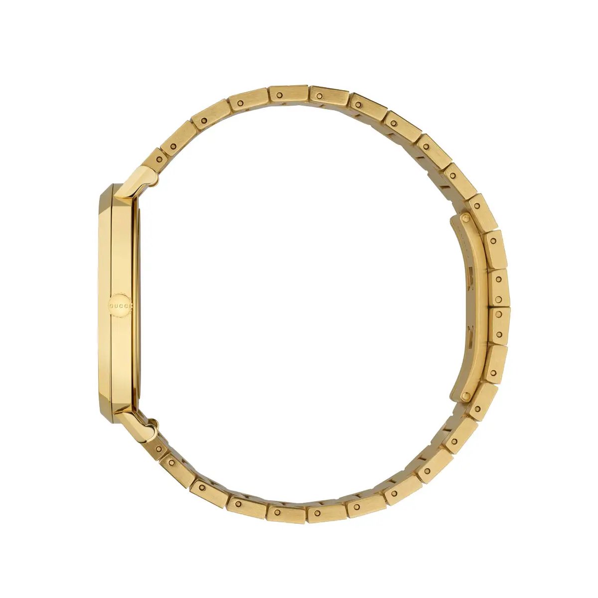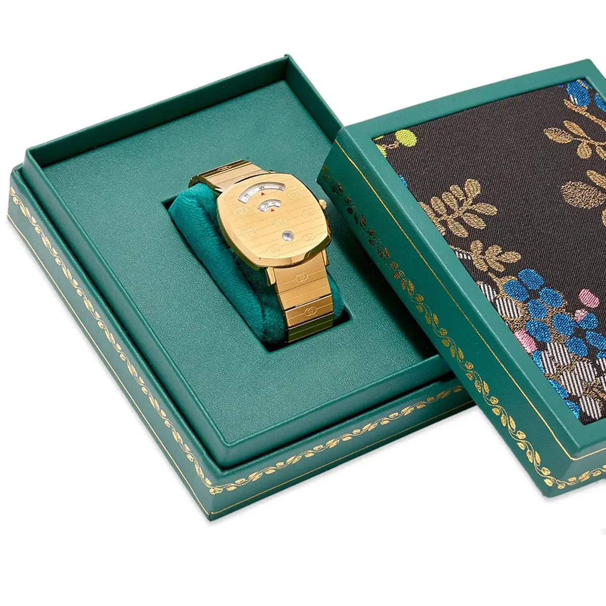 Gucci Grip YA157409 nổi bật khi kết hợp chủ nghĩa tối giản hiện đại với DNA biểu tượng của hãng. Mẫu máy dùng vỏ vuông 38 mm bằng thép / mạ vàng vàng, kính sapphire, cùng vành bezel thép / mạ vàng vàng. Tổng thể đồng nhất với dây thép mạ vàng vàng (tông vàng) và khóa gập, cho cảm giác gọn chắc, sang trọng trên cổ tay.