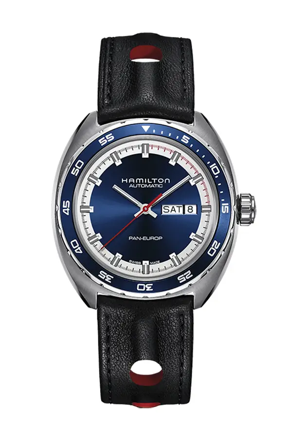 Mẫu đồng hồ nam American Classic Pan Europ Day Date Automatic H35405741 của Hamilton thu hút sự chú ý đặc biệt nhờ thiết kế độc đáo. Dây đeo da đen được trang trí tinh xảo kết hợp với vỏ thép không gỉ có đường kính 42mm. Viền bezel thép-nhôm màu xanh hiển thị phút. Trên mặt số, bạn sẽ thấy hiển thị ngày và thông tin về ngày cụ thể trong tuần.