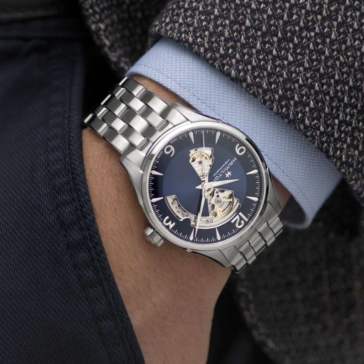 Bộ sưu tập mang đến đa dạng mẫu mã - từ những phiên bản đơn giản với ba kim, đến đồng hồ bấm giờ, cho đến các mẫu có chức năng phức tạp như dự trữ năng lượng, mở tim hoặc điều chỉnh. Đồng hồ Jazzmaster có sẵn trong nhiều kích thước và chất liệu, với dây da hoặc dây thép, và luôn được trang bị bộ máy cơ học Thụy Sĩ đáng tin cậy.