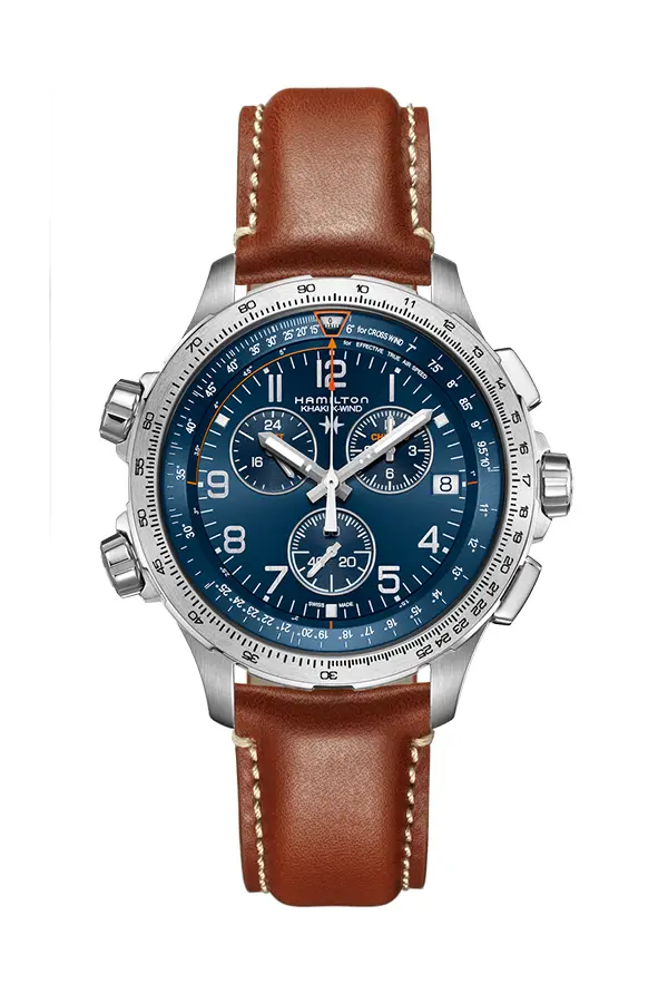Đồng hồ nam Khaki Aviation X-Wind GMT Chrono Quartz H77922541 của Hamilton không chỉ hiển thị thời gian mà còn hiển thị ngày, các chỉ số liên quan đến chronograph và biến động do gió mạnh gây ra. Đồng hồ gây ấn tượng với độ bền bỉ, là kết quả của sự kết hợp giữa vỏ thép chắc chắn 46mm và dây đeo da nâu dày dặn. Tất cả các quý ông yêu thích phong cách thể thao sẽ hài lòng khi biết rằng họ có thể đeo đồng hồ này khi bơi lội.