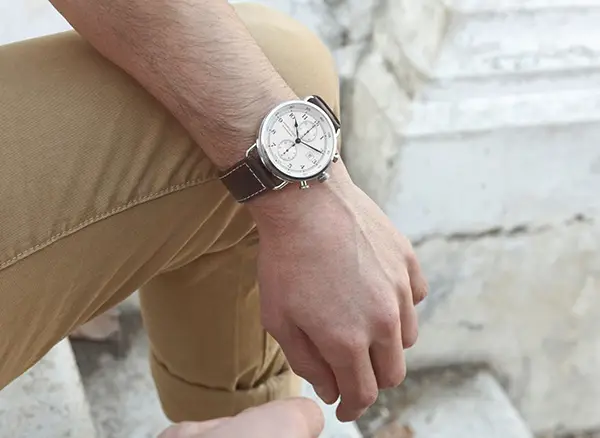 Mặt số analog màu trắng thanh lịch hiển thị thời gian rõ ràng, đồng thời tích hợp chức năng chronograph và hiển thị ngày, phù hợp với những quý ông có gu thẩm mỹ tinh tế. Dây da nâu với khóa gài truyền thống mang lại sự thoải mái và an toàn khi đeo.