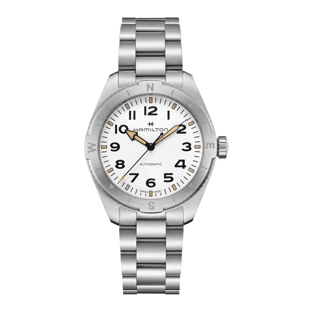 Hamilton Khaki Field Expedition kết hợp giữa độ bền, tính năng và phong cách, hoàn hảo cho tất cả những người yêu thích phiêu lưu. Vỏ đồng hồ bằng thép không gỉ có đường kính 41mm, trang bị vành bezel xoay có la bàn và hai núm vặn vít, là công cụ lý tưởng cho việc định hướng trong môi trường khắc nghiệt. Mặt số màu trắng mờ với các chữ số đen tương phản và kim phát quang đảm bảo độ rõ nét tuyệt vời trong mọi điều kiện.