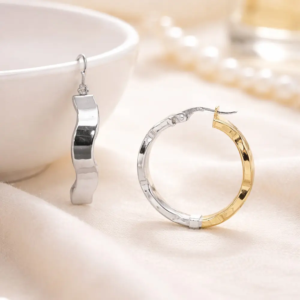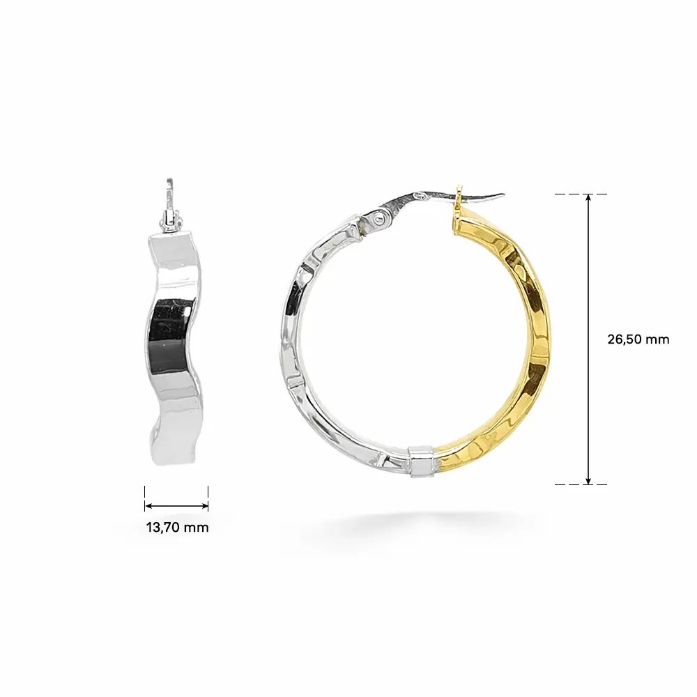 Đôi hoa tai tròn bằng vàng kết hợp gây ấn tượng với sự hòa quyện tinh tế của hai tông màu vàng cùng đường nét lượn sóng nhẹ, mang đến vẻ đẹp hiện đại cho thiết kế tròn cổ điển. Bề mặt đánh bóng phản chiếu ánh sáng đẹp mắt, làm nổi bật sự tương phản tinh tế giữa các chi tiết.