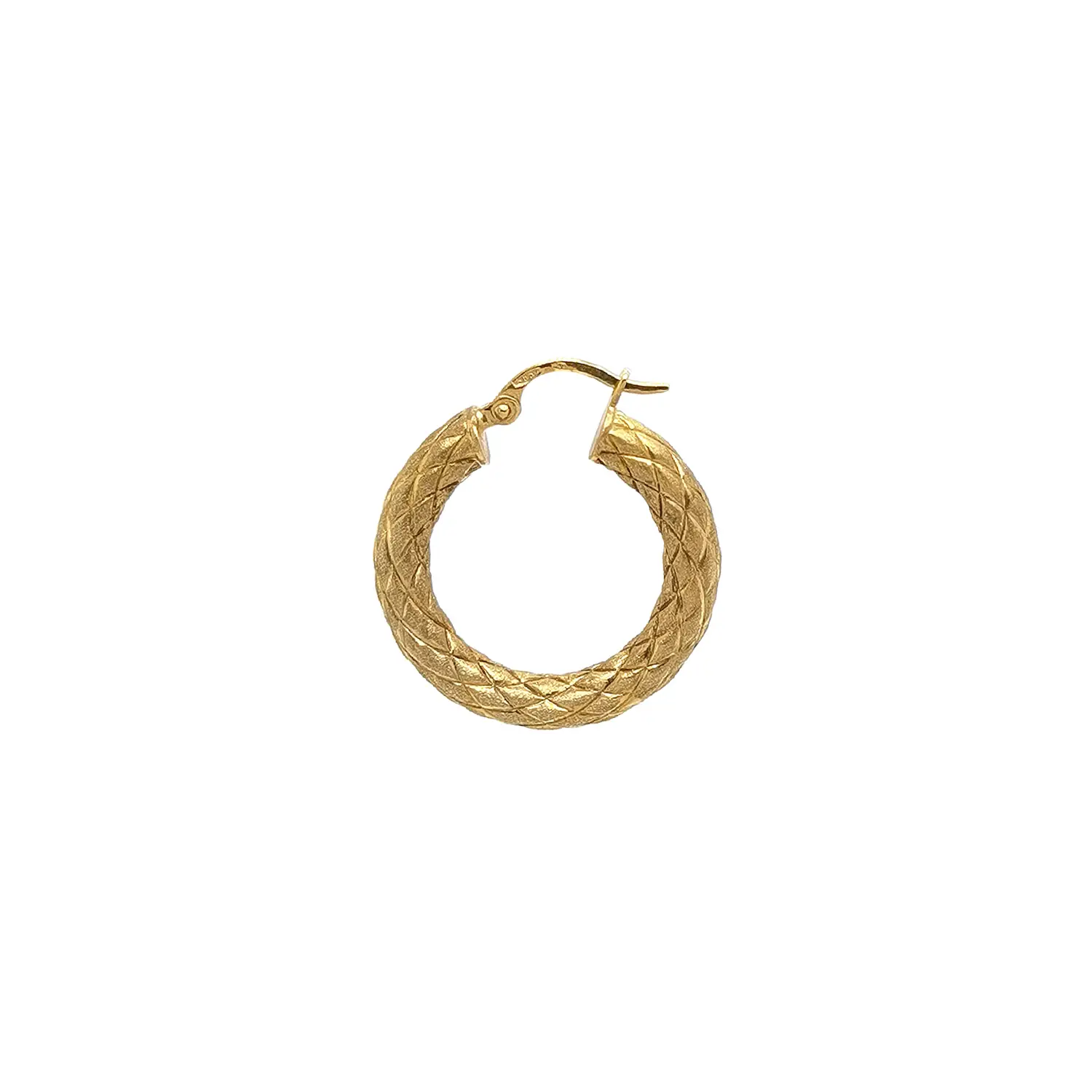 Đôi hoa tai tròn bằng vàng 14K này gây ấn tượng mạnh với bề mặt họa tiết dệt độc đáo. Lớp hoàn thiện mờ và dạng nổi tạo nên chiều sâu và sự tinh tế, phản chiếu ánh sáng nhẹ nhàng, mang đến vẻ sang trọng pha chút cổ điển. Thiết kế bản dày hơn tạo cảm giác thanh lịch nhưng vẫn đầy cá tính—hoàn hảo cho những ai yêu thích phong cách độc đáo và tinh xảo.