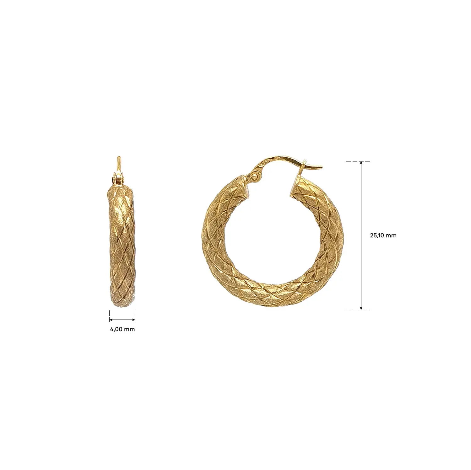 Với đường kính 25,10 mm, đôi hoa tai có kích thước trung bình lý tưởng—nổi bật nhưng vẫn dễ chịu khi đeo cả ngày. Khóa bấm chắc chắn đảm bảo sự an tâm khi sử dụng hằng ngày. Lựa chọn tuyệt vời cho những người yêu thích hoa tai tròn vàng với họa tiết nổi bật, trang trí tinh tế và phong cách thanh lịch vượt thời gian.